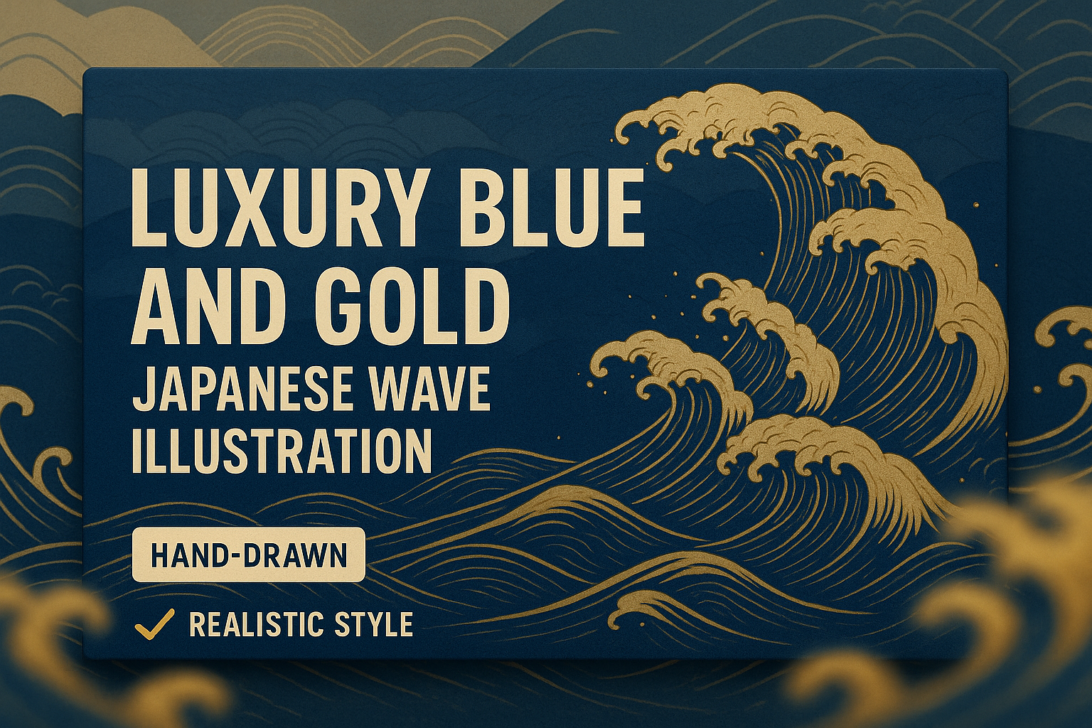 Luxury Hand-Drawn Japanese Wave Illustration in Blue and Gold