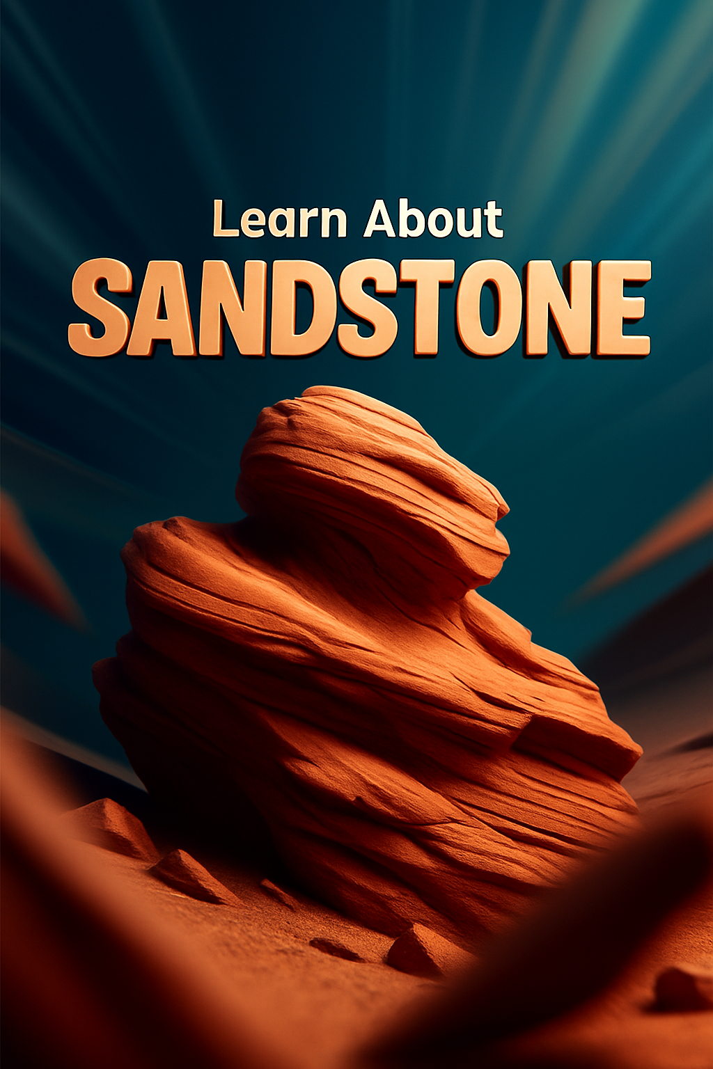 A vibrant 3D illustration of a sandstone formation, highlighted by dynamic rays emanating from the center. The design features engaging typography emphasizing the word 'SANDSTONE' in a bold style.