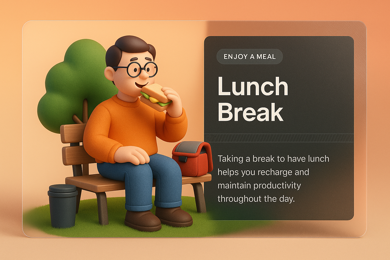 /Collection: /by davooda/Type: PNG/A vibrant 3D illustration depicting a character enjoying a lunch break on a park bench, with a stylish overlay showcasing the text 'Lunch Break' and a brief description about productivity.
