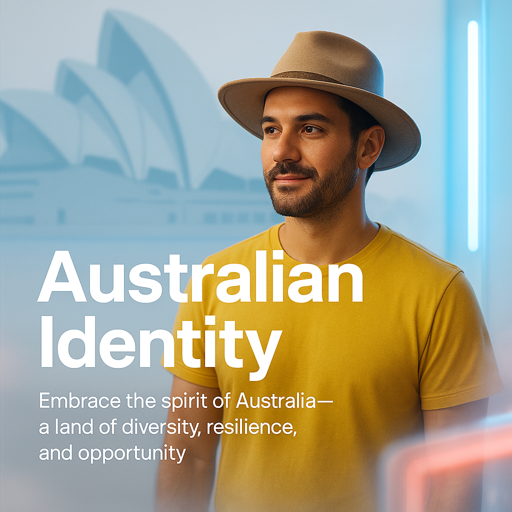 /Collection: /by davooda/Type: PNG/A vibrant promotional image showcasing a man in a casual setting, emphasizing the theme of Australian identity and diversity. The modern design elements and warm colors appeal to a broad audience interested in cultural representation.