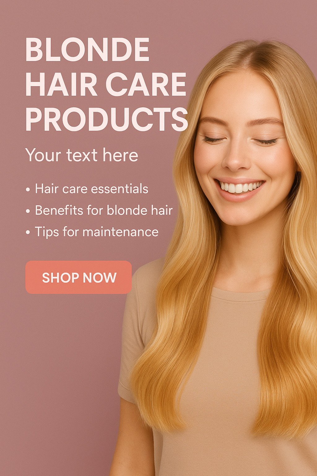 /Collection: /by davooda/Type: PNG/Stylish promotional banner showcasing hair care products for blonde hair. Features a smiling model with soft, wavy hair against a pastel background, ideal for beauty marketing.
