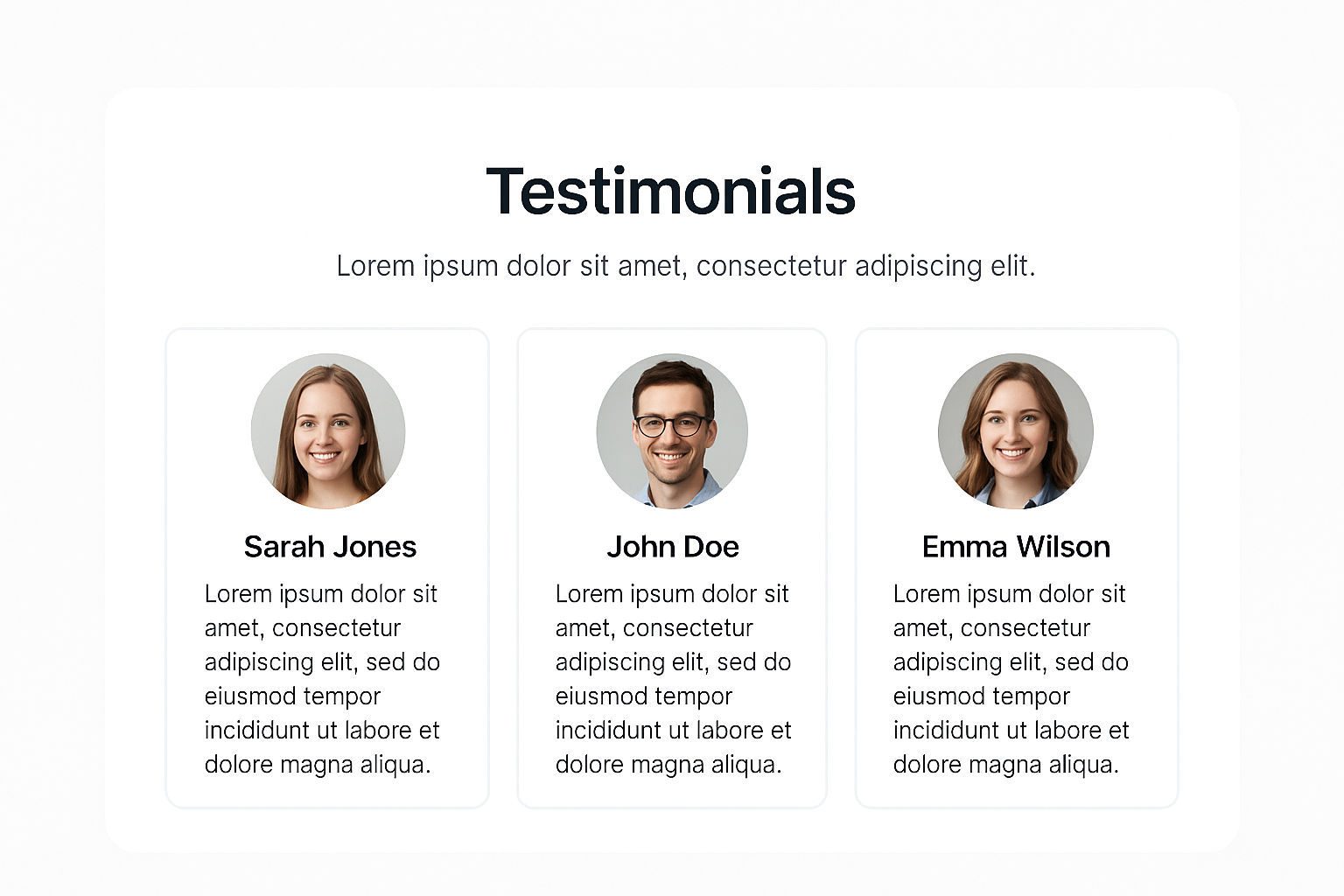 A visually appealing design for a testimonials section featuring three cards with circular photos, names, and testimonial text. Ideal for AI-related web pages.