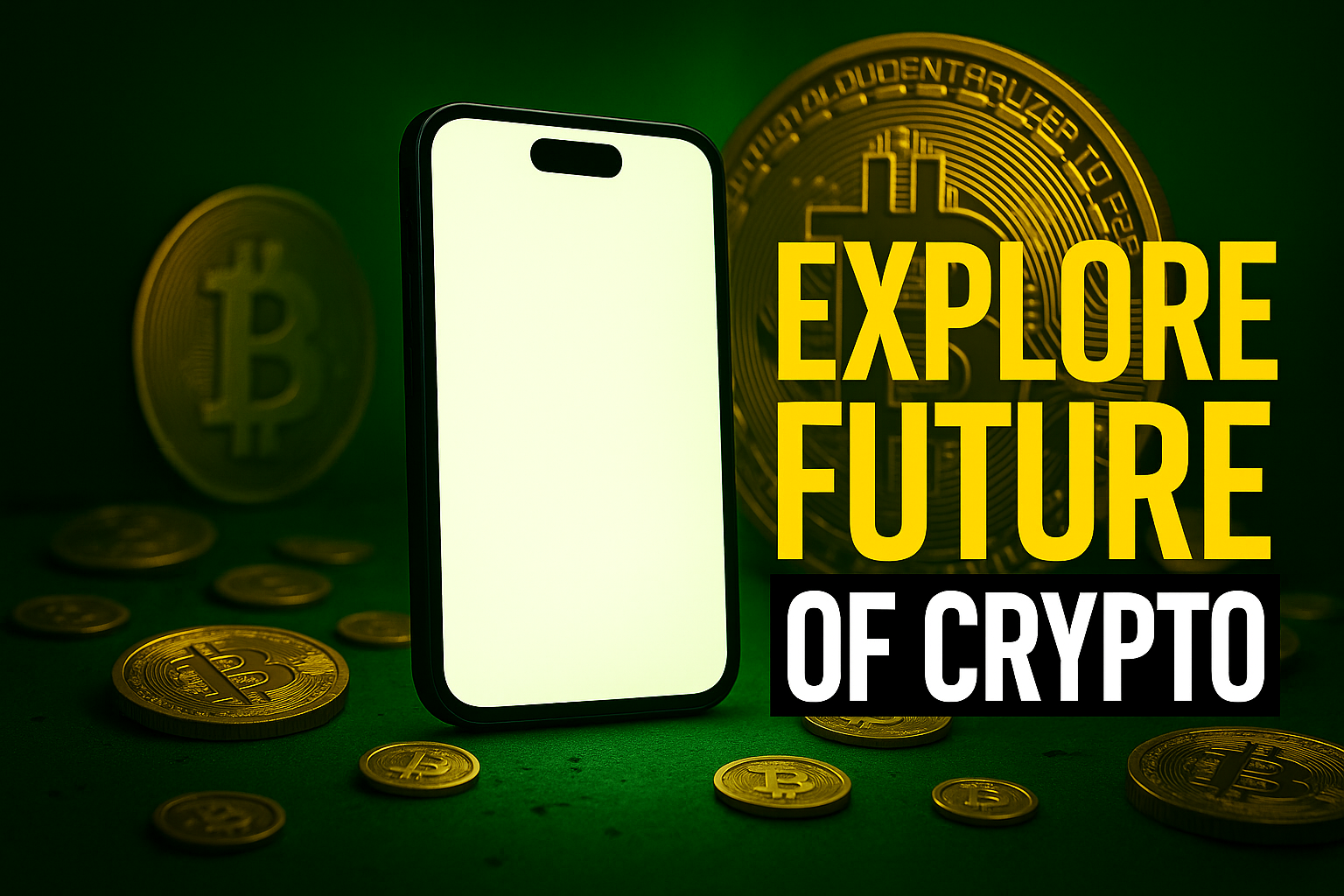 Engaging social media graphic showcasing a smartphone surrounded by cryptocurrency coins, designed to promote discussions about the future of crypto.