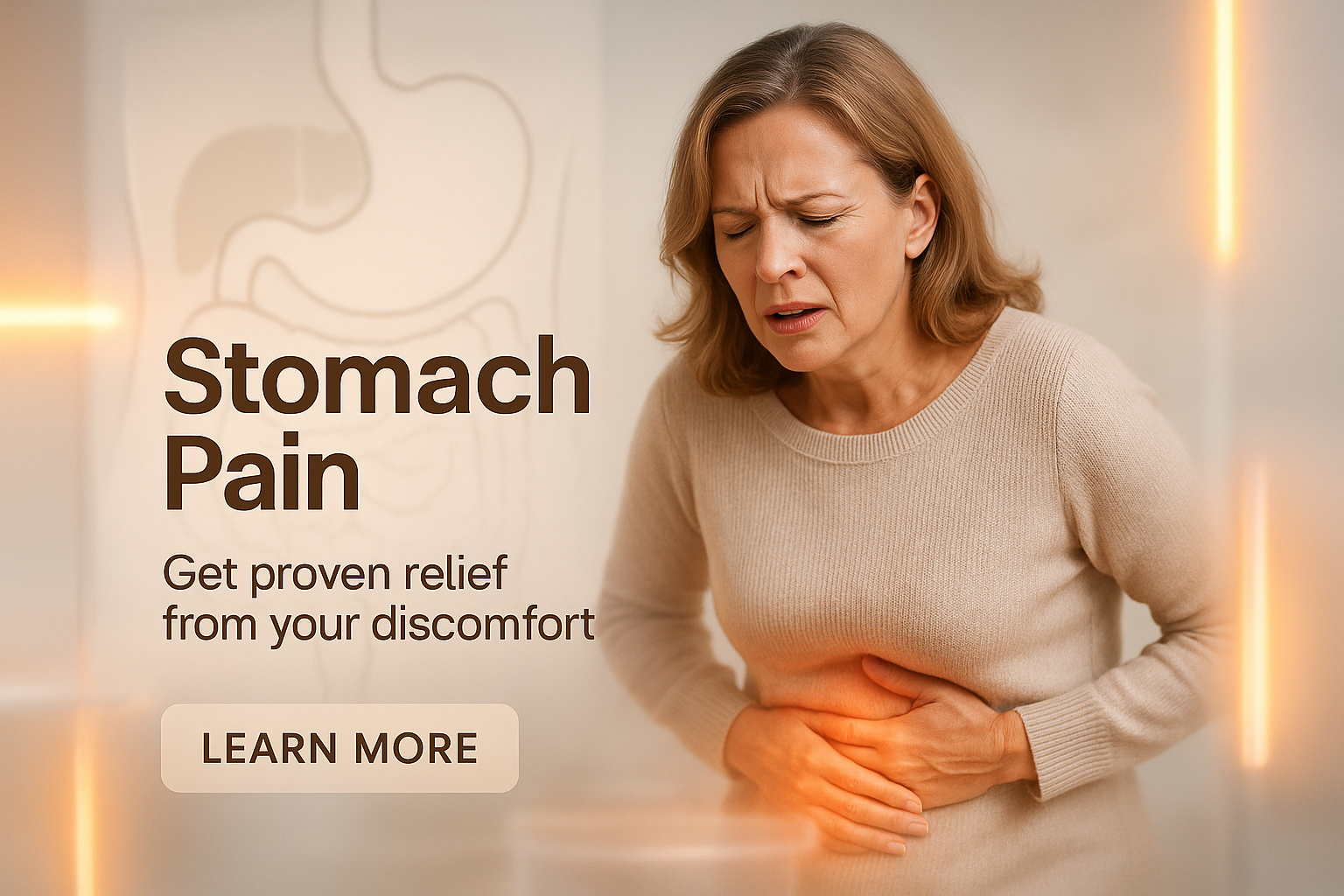 /Collection: /by davooda/Type: PNG/A promotional banner highlighting stomach pain relief solutions, featuring a concerned woman. The design uses warm colors and modern typography, suitable for health-related marketing.