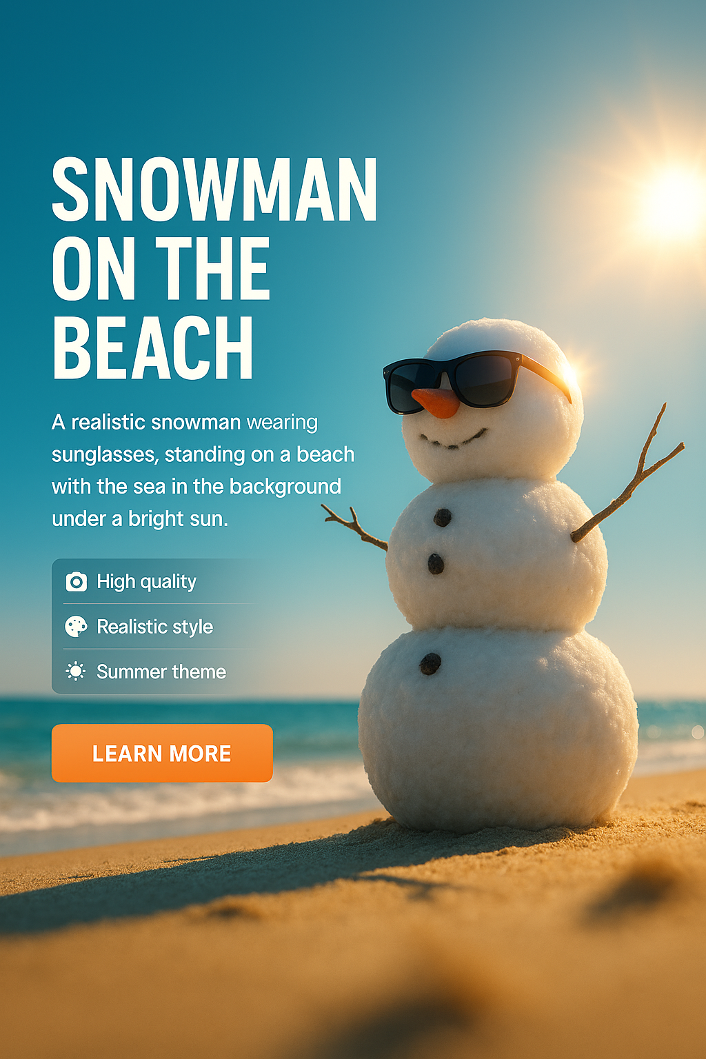 This vibrant image features a realistic snowman wearing sunglasses, standing on a beach. It has a summer theme and is ideal for promotional or seasonal content.