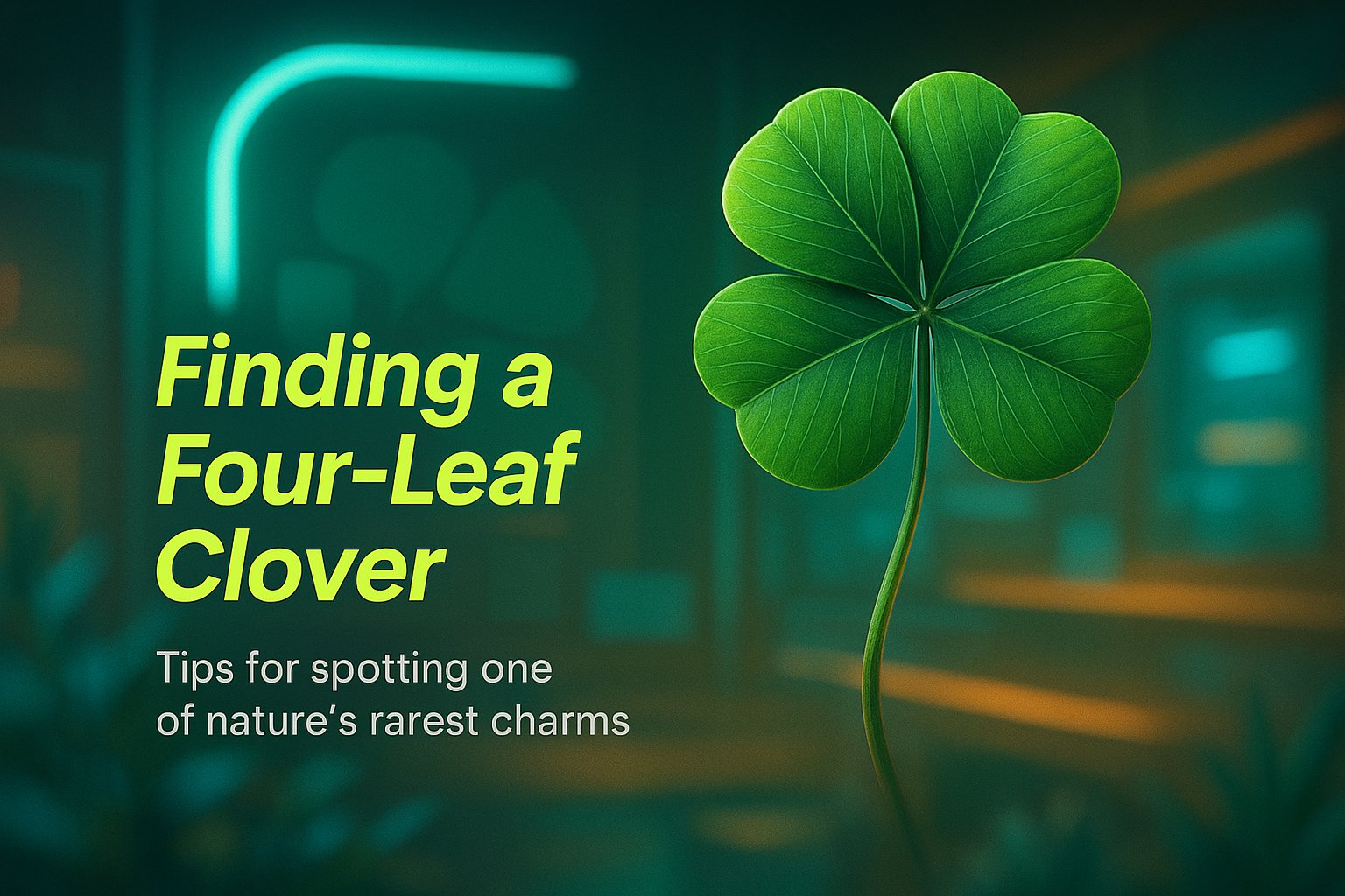 A visually engaging graphic featuring a four-leaf clover with tips for finding this rare plant. Ideal for nature enthusiasts and educational content.