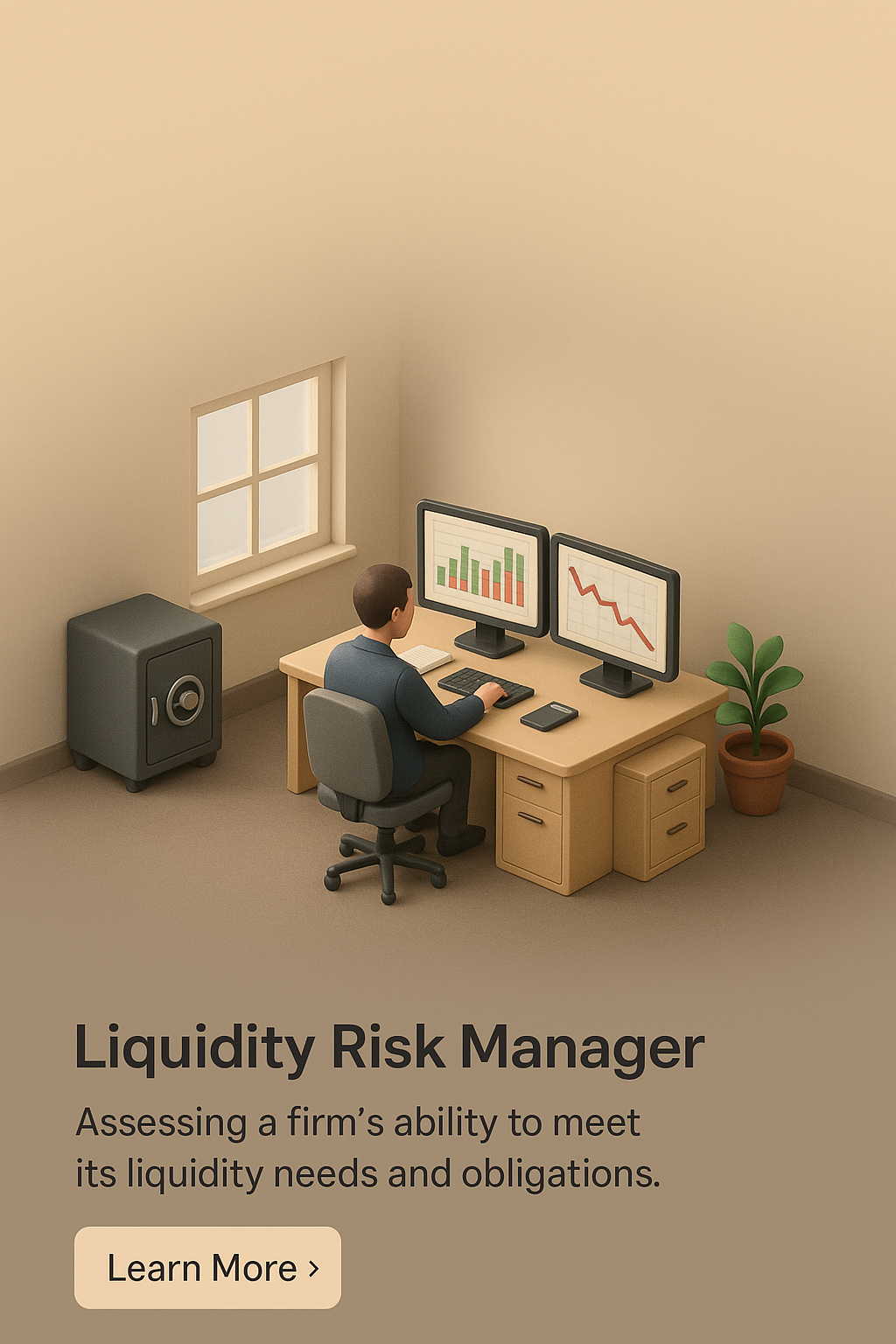 /Collection: /by davooda/Type: PNG/A detailed 3D illustration depicting a liquidity risk manager at a desk with dual monitors, assessing financial data. The scene is designed with a smooth gradient background.