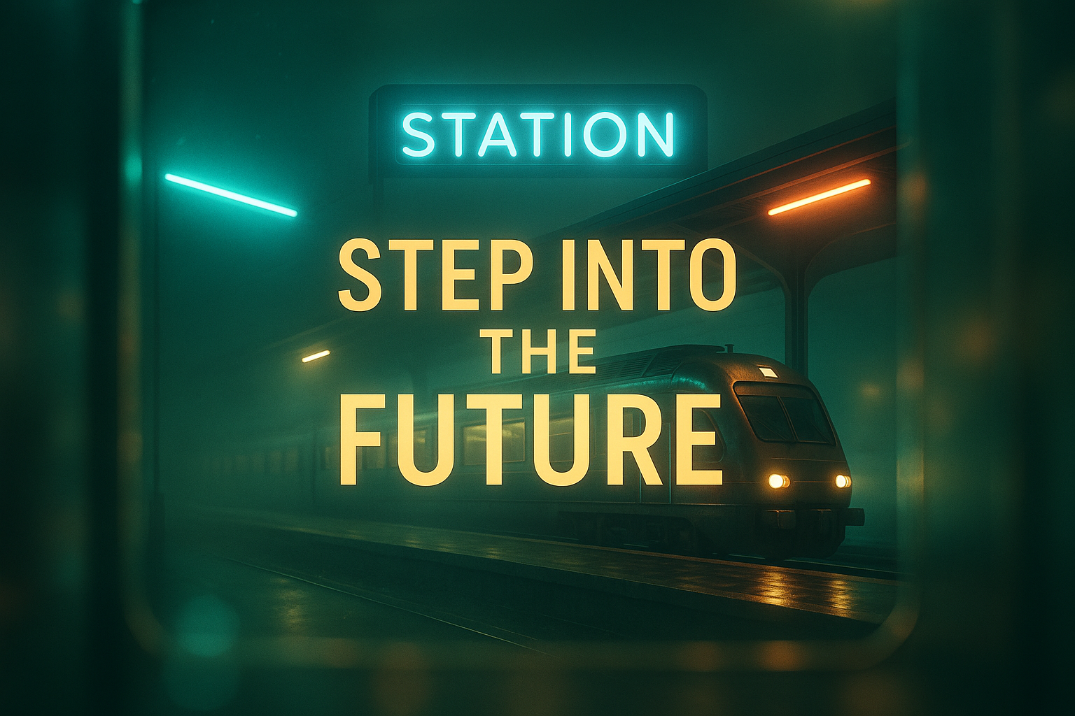 /Collection: /by davooda/Type: PNG/A futuristic train station scene featuring neon lights and a translucent glass structure. The atmosphere is misty, with glowing accents and clear text inviting viewers to step into the future.