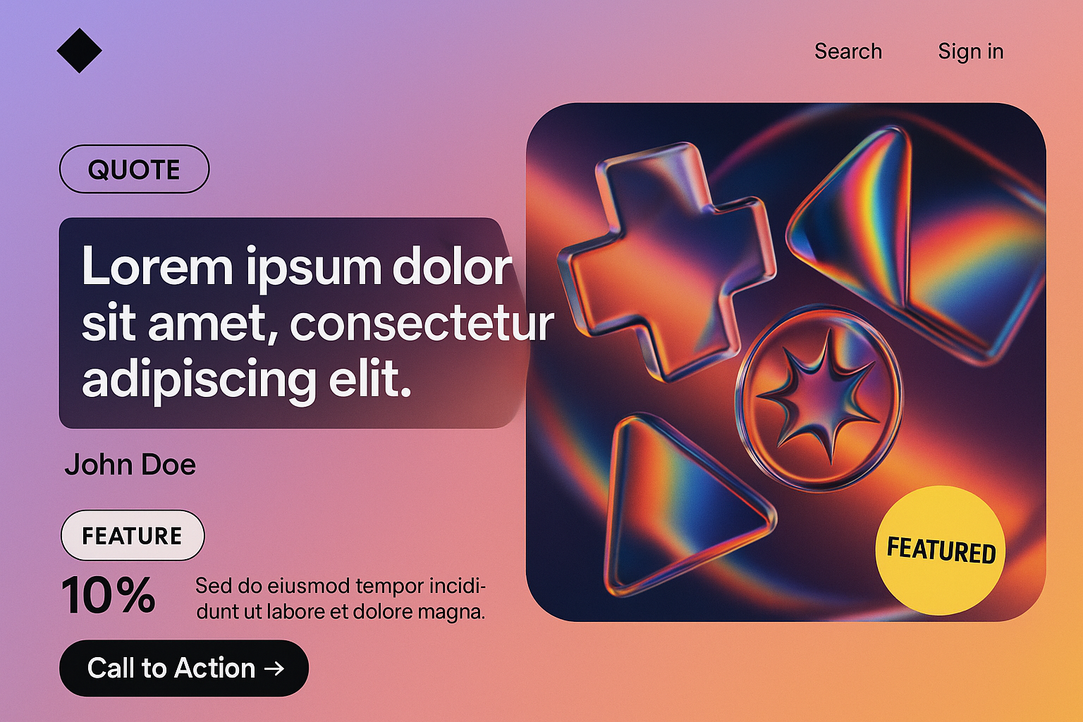 A visually striking landing page featuring geometric shapes with a blurred glass effect. Includes a quote, action button, and modern design elements.