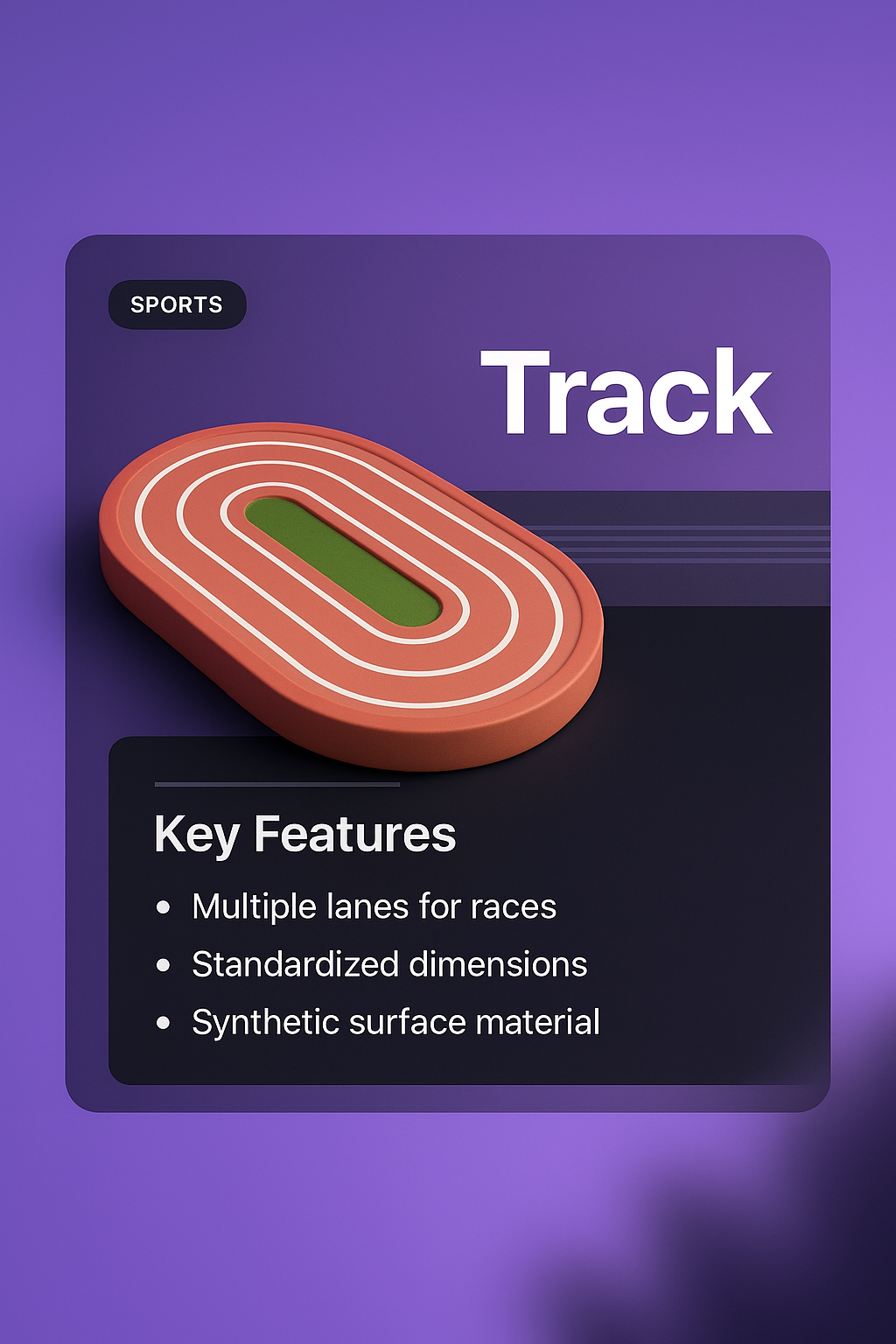A visually appealing 3D illustration of a track, featuring a dark panel with key features listed. The design incorporates a smooth gradient background and layered composition for depth.