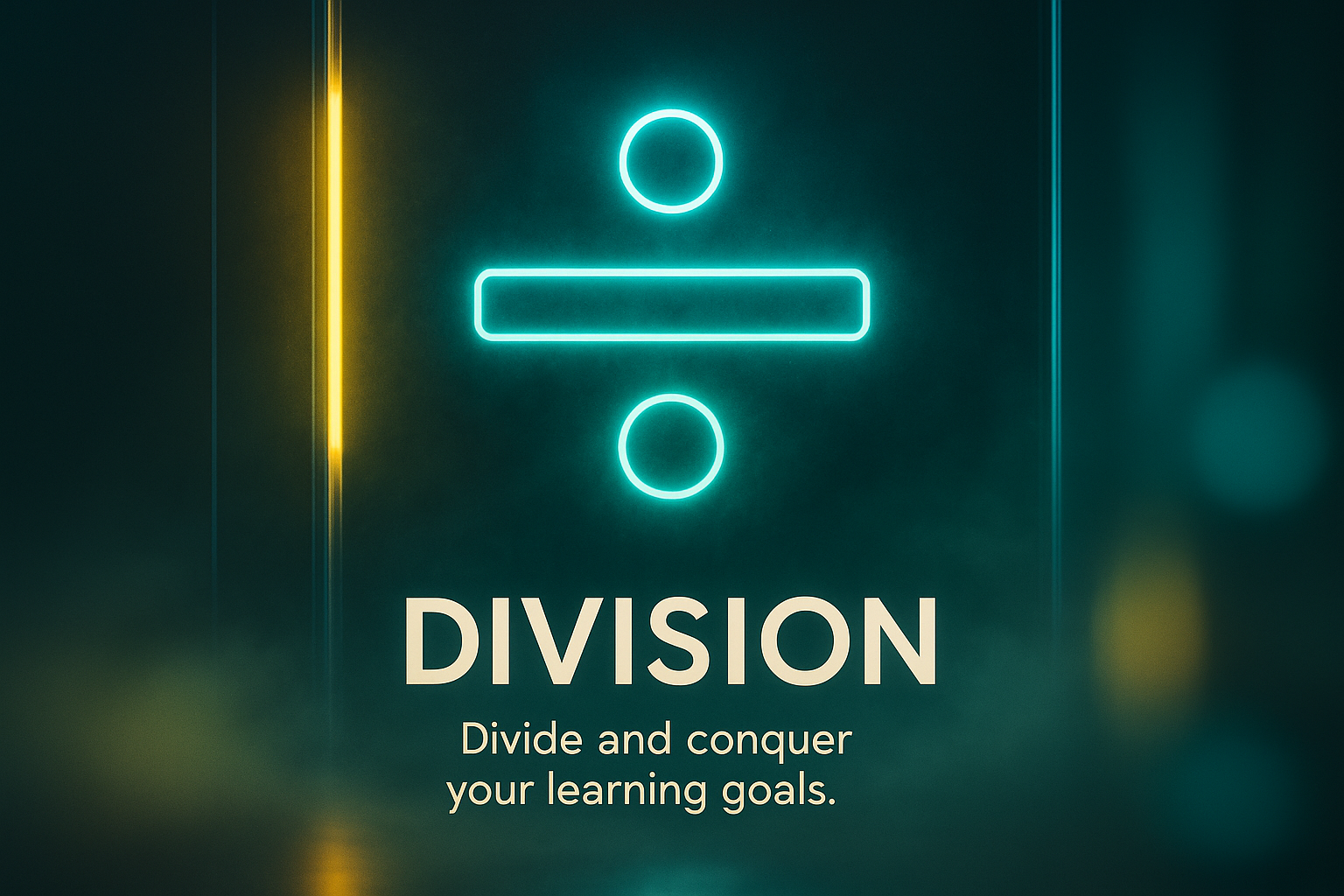 /Collection: /by davooda/Type: PNG/An artistic representation of the concept of division, featuring neon lights and a translucent glass effect. The main visual element is a division symbol, accompanied by engaging text in a professional yet inviting style.