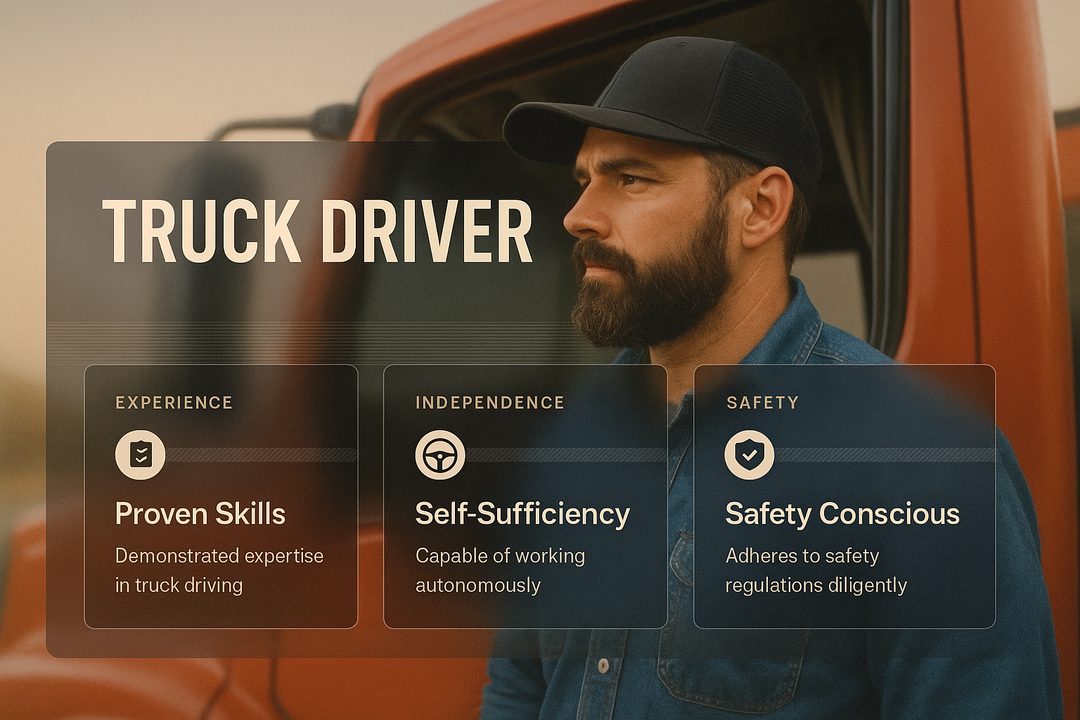 /Collection: /by davooda/Type: PNG/A visually appealing web design concept featuring a male truck driver alongside three highlighted blocks showcasing experience, independence, and safety skills. The design integrates transparent elements for a modern look.