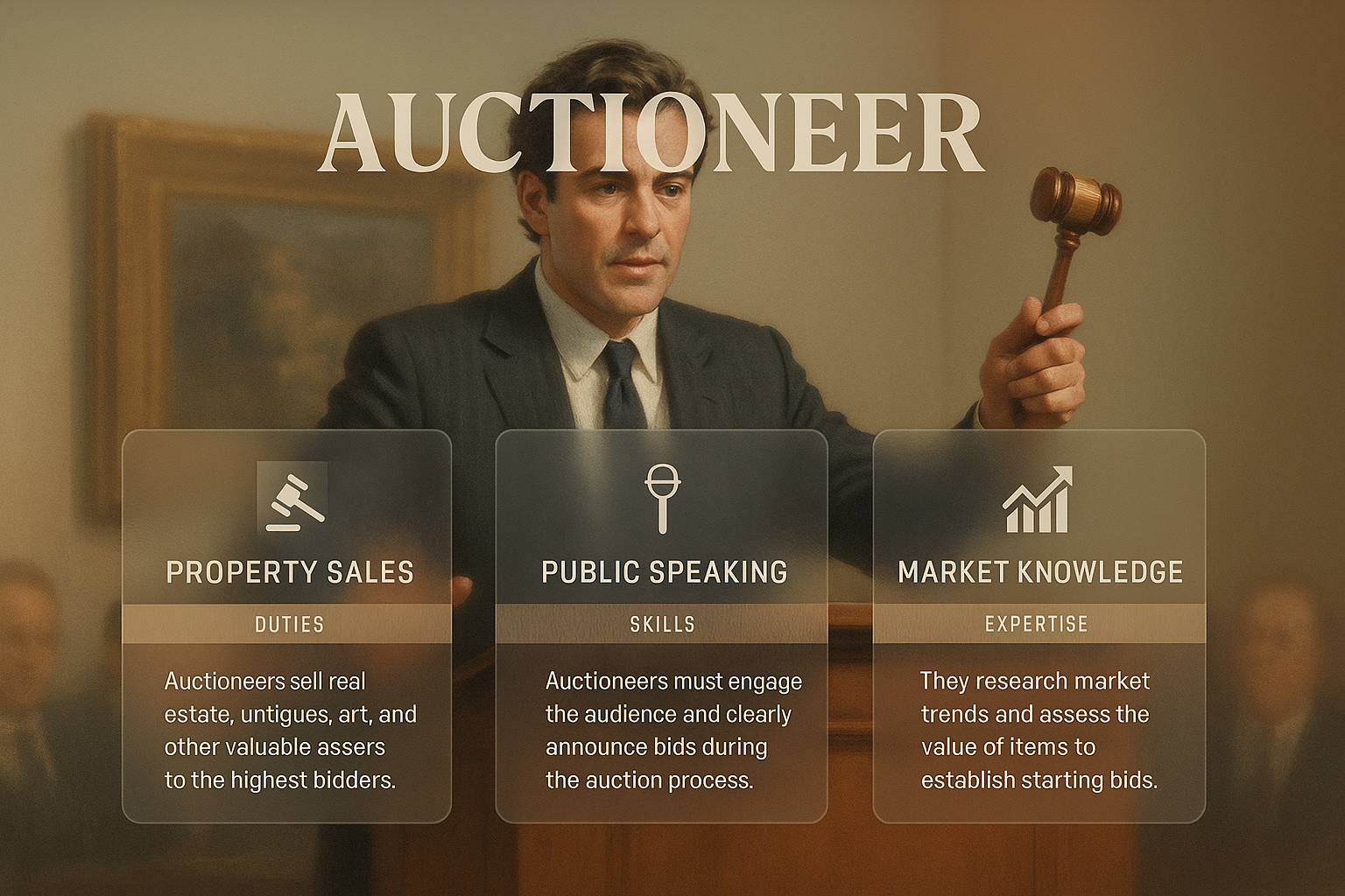 A stylish web block featuring an auctioneer with three distinct sections highlighting property sales, public speaking, and market knowledge. The design integrates transparent elements for a modern look.