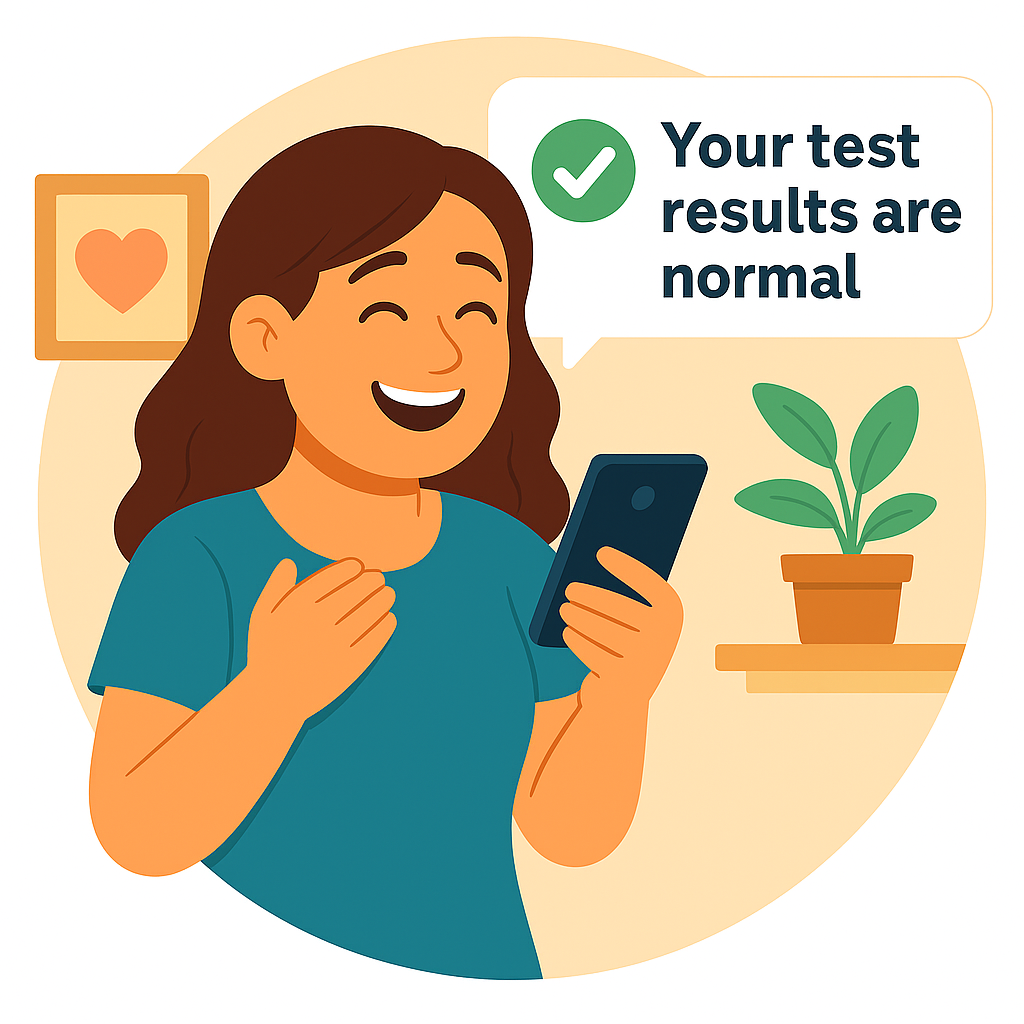 /Collection: /by davooda/Type: PNG/A cheerful digital illustration depicting a person receiving good health news on their phone, ideal for healthcare communication or wellness-related content.