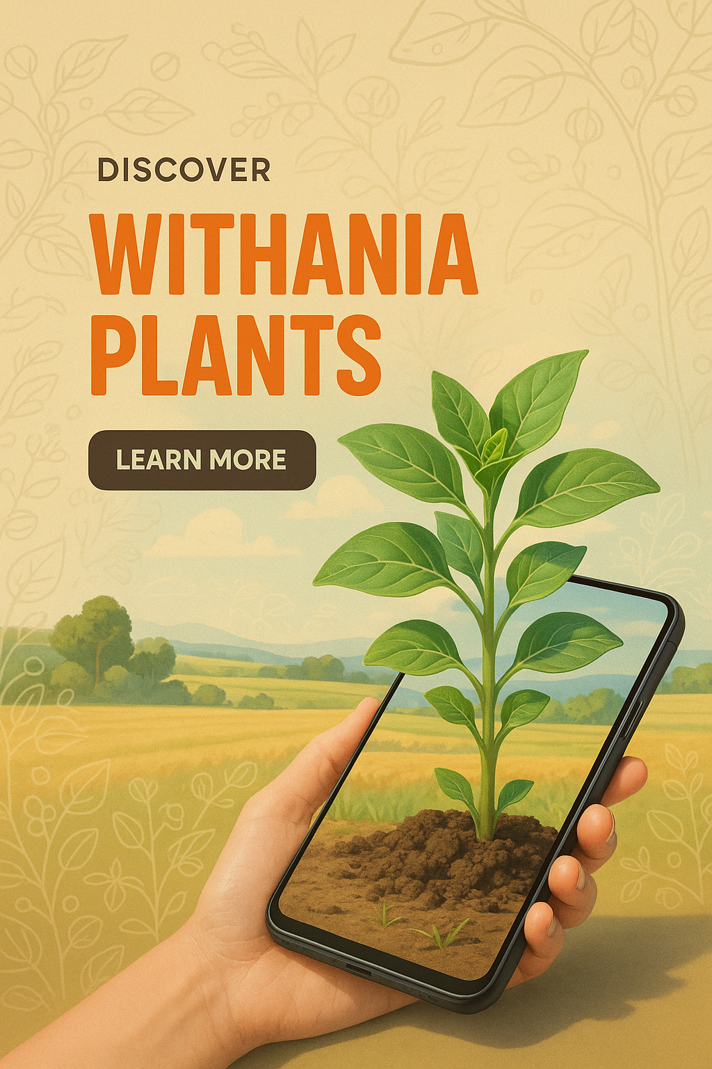 /Collection: /by davooda/Type: PNG/A vibrant advertisement featuring a young Withania plant emerging from a smartphone in a countryside setting. The design includes playful typography and a well-balanced layout.