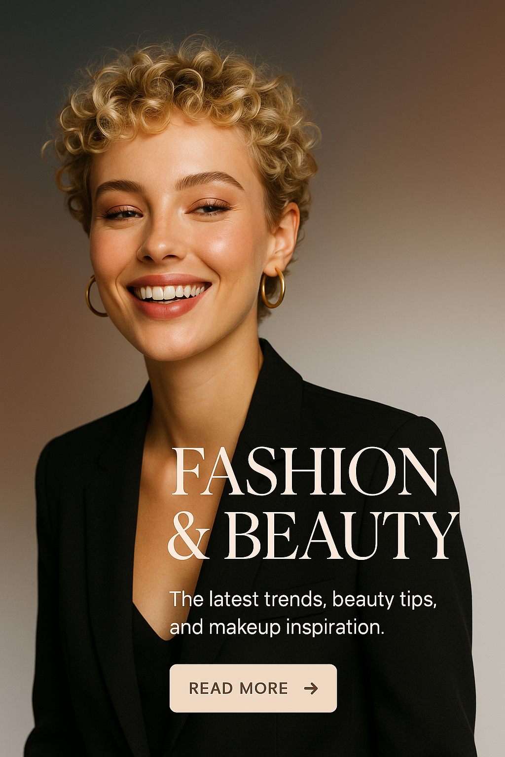 /Collection: /by davooda/Type: PNG/A blonde model with short curly hair smiles confidently, showcasing a fashion and beauty theme. The background features a gradient from dark to light, accentuating her stylish look.
