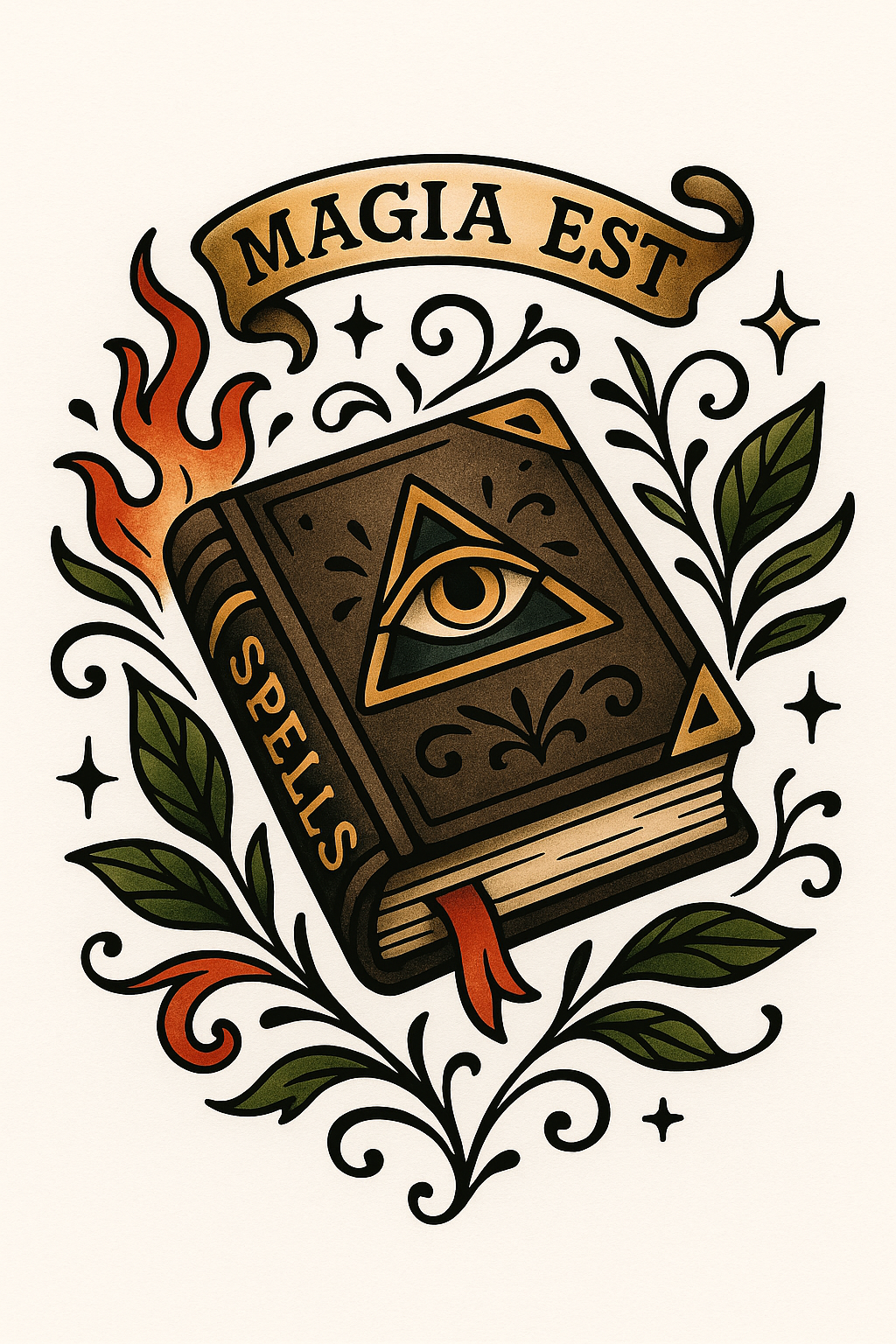 A stylized illustration of a spellbook featuring an eye symbol and decorative elements, ideal for fantasy-themed projects, merchandise, or digital art.