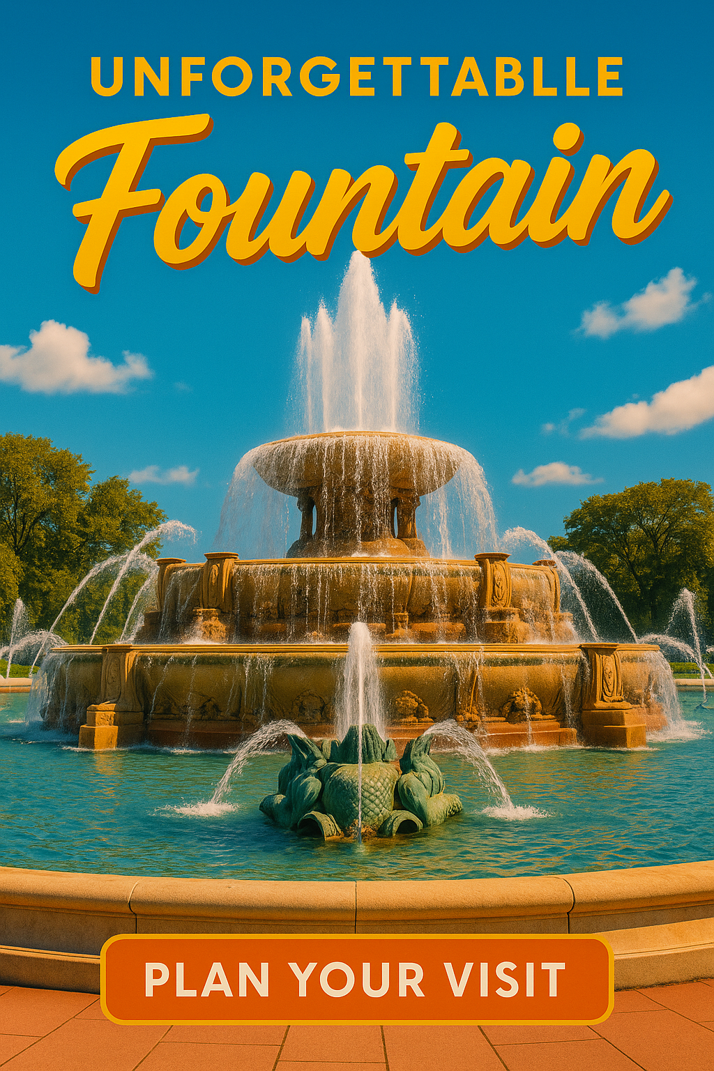 A stunning image of a vibrant fountain surrounded by lush greenery, showcasing a bright blue sky. The scene evokes joy and invites viewers to experience the beauty.