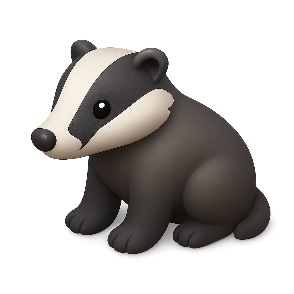A cute and stylized 3D badger icon presented in a three-quarter view. The badger features smooth, rounded shapes and a glossy finish, set against a subtle dark background.