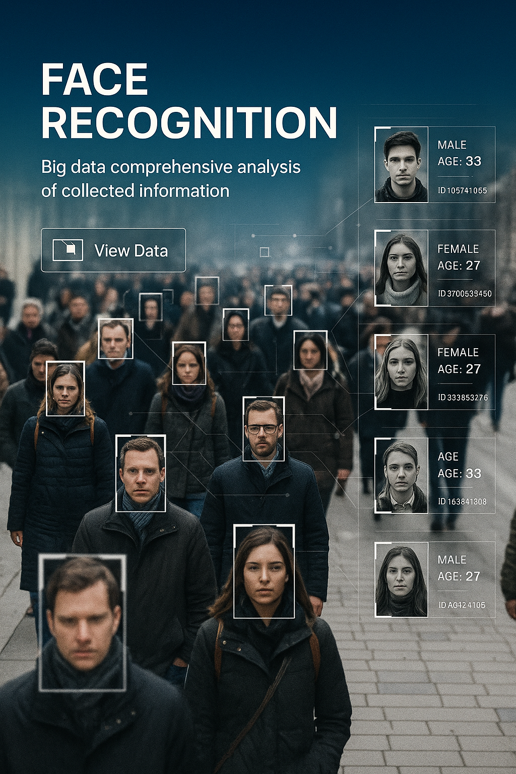 A crowded urban scene showcasing facial recognition technology. Individuals are identified with age and ID information displayed, emphasizing big data analysis.