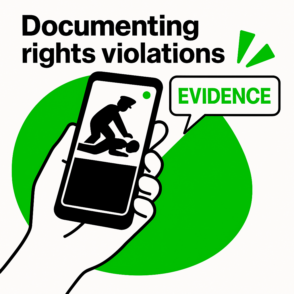 /Collection: /by davooda/Type: PNG/An informative graphic showcasing the act of documenting rights violations using a smartphone, featuring modern design elements and bold imagery, suitable for advocacy and awareness campaigns.