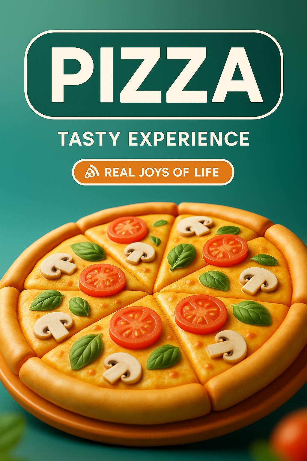 A vibrant 3D illustration of a pizza featuring fresh ingredients like tomatoes, mushrooms, and basil. The design is clean with a smooth gradient background, emphasizing the pizza as the focal point.