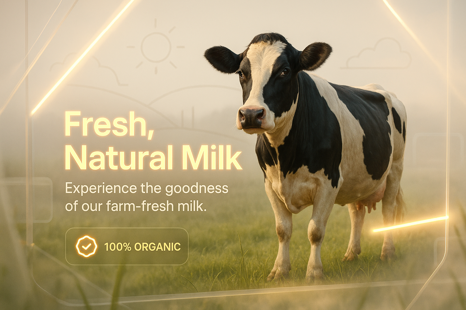 /Collection: /by davooda/Type: PNG/Engaging promotional image showcasing a cow in a serene farm environment, emphasizing the freshness and organic quality of milk. Ideal for dairy marketing and branding.