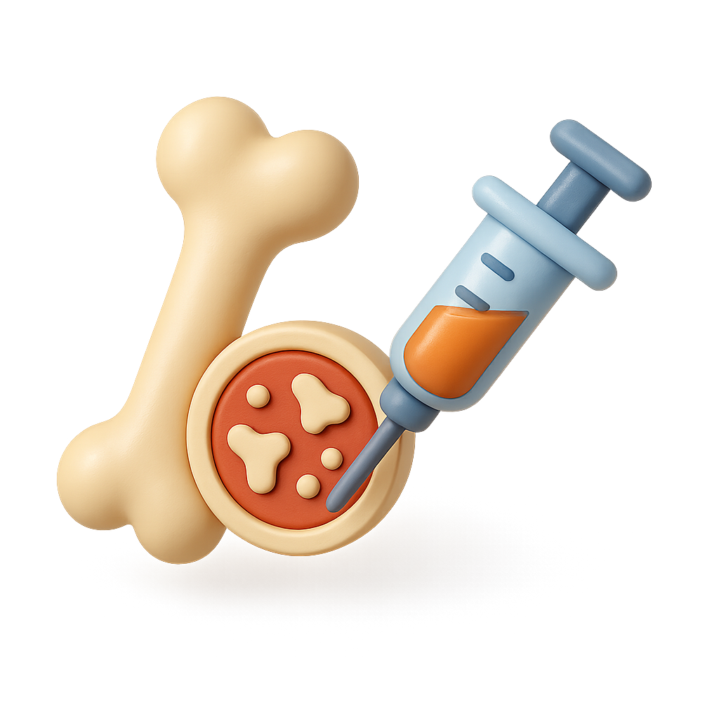 A playful 3D icon featuring a syringe next to a bone, with a pizza-like design on the surface. The icon combines elements of fun and food, making it visually engaging.