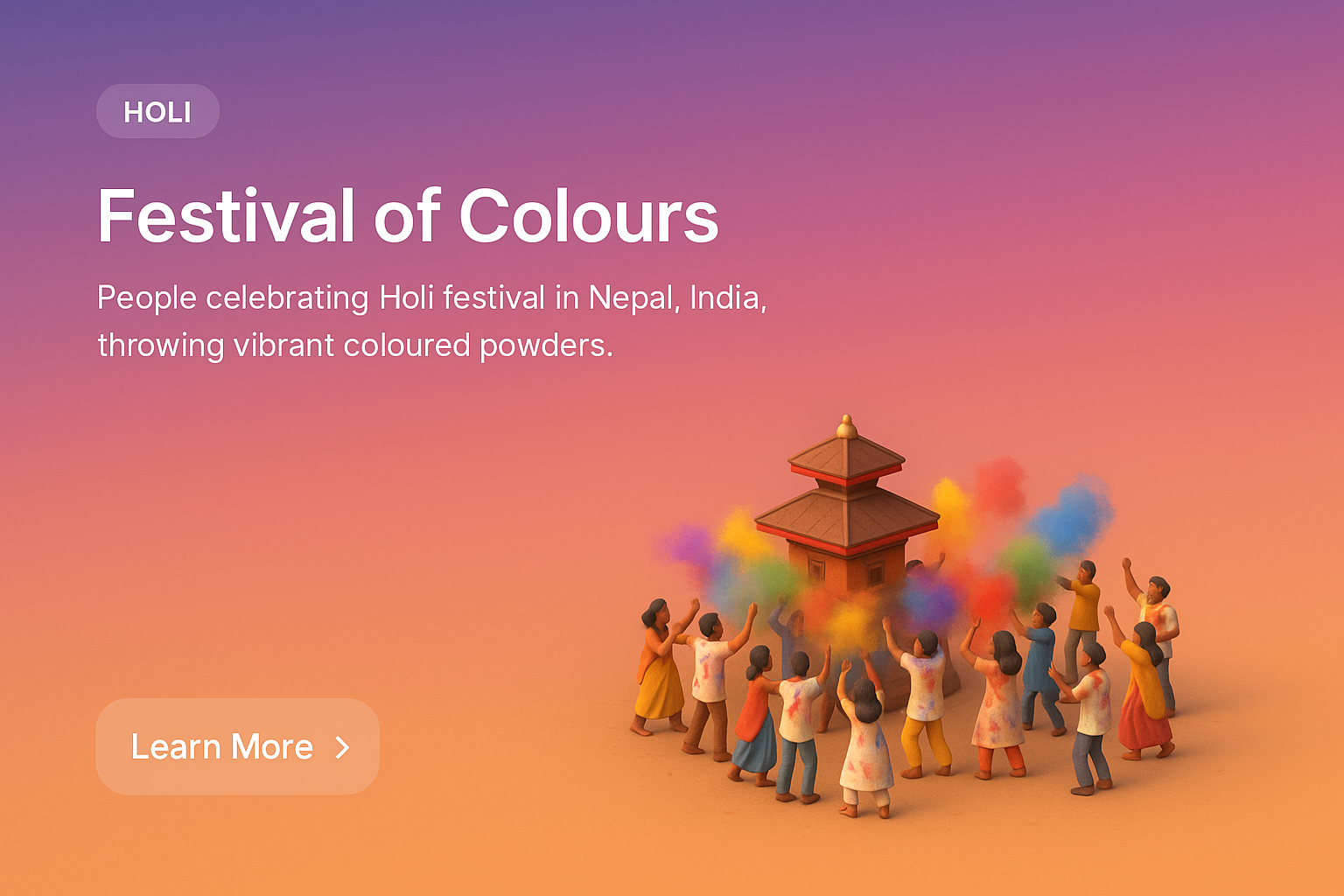/Collection: /by davooda/Type: PNG/A vibrant 3D illustration depicting the Holi festival in Nepal, featuring people joyfully throwing colored powders around a traditional temple. The scene captures the festive atmosphere from a zoomed-out perspective.