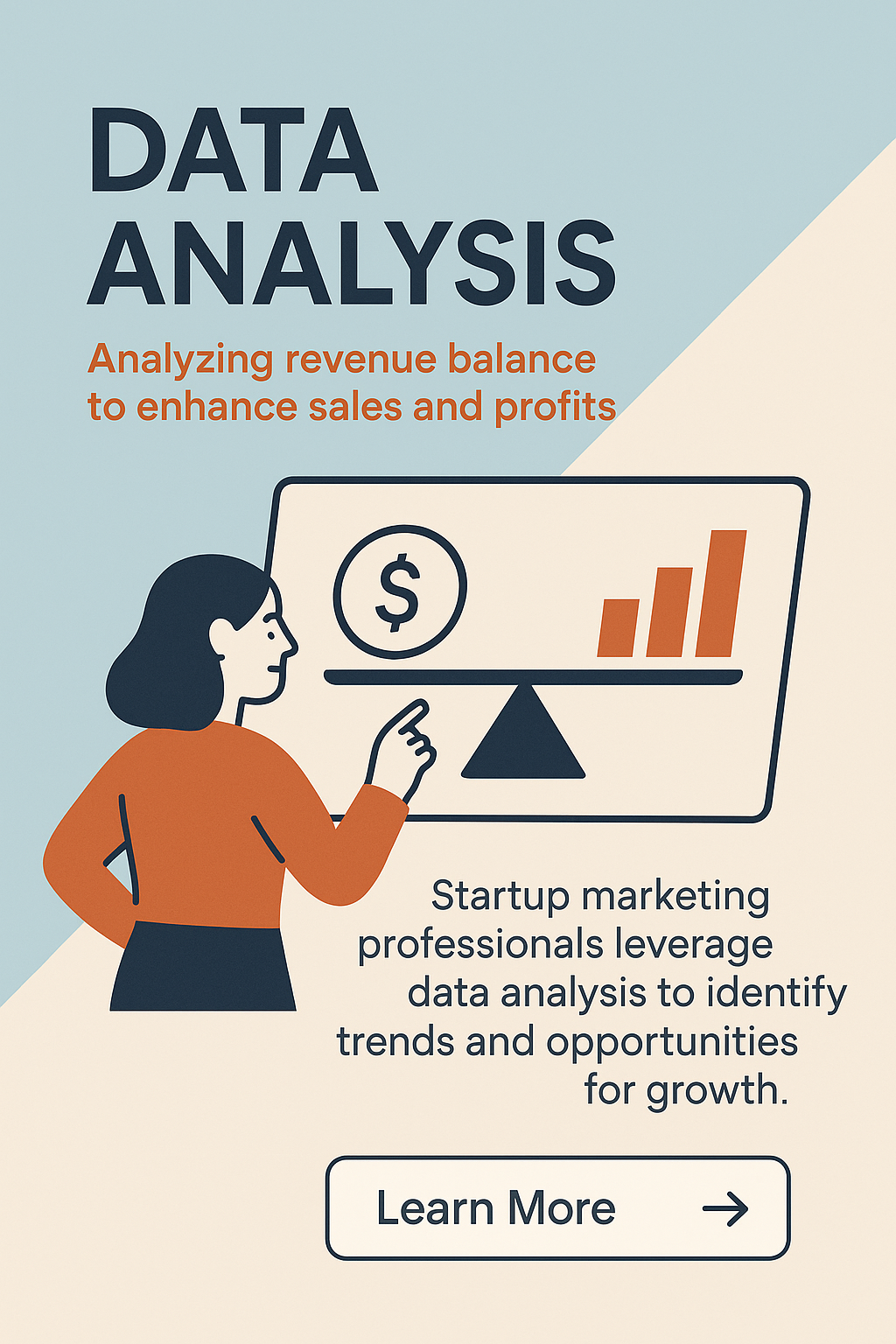 /Collection: /by davooda/Type: PNG/An informative graphic illustrating a marketing professional analyzing revenue data on a computer screen. It highlights strategies for startups to boost sales and profits.