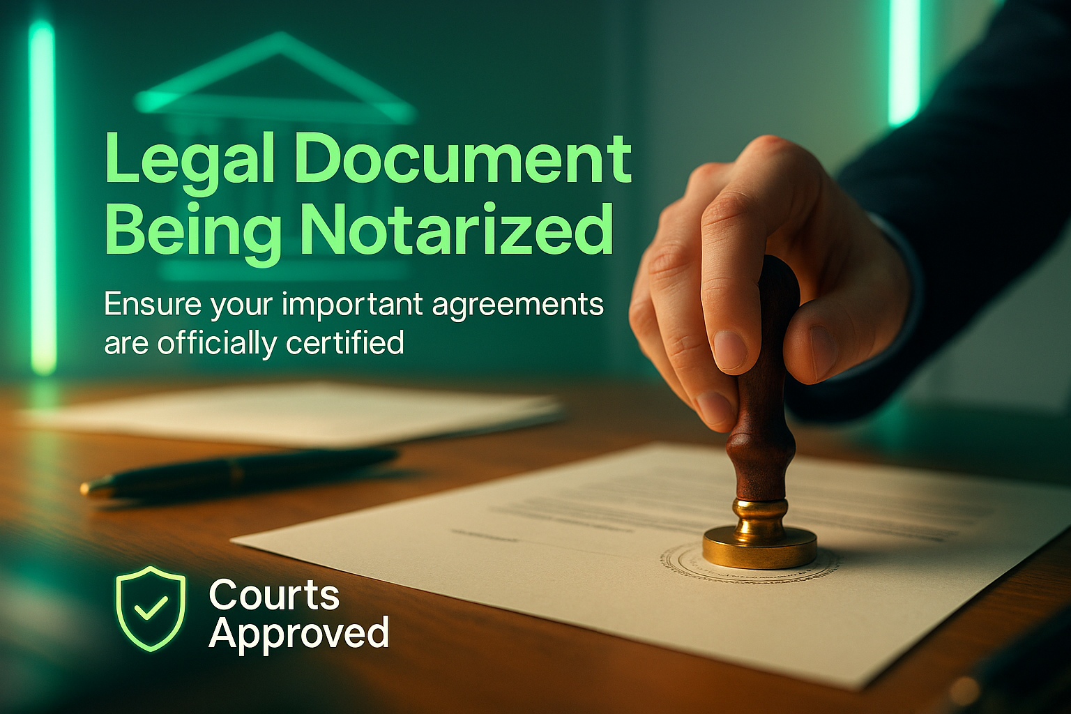 A visually engaging image showcasing the process of notarizing a legal document, featuring a hand stamping a seal, perfect for legal service promotions.