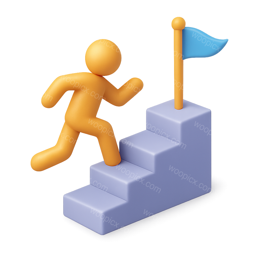 A vibrant 3D icon depicting a stylized figure ascending stairs towards a flag, showcasing a sense of achievement and progress. The design features a colorful palette and a transparent background.