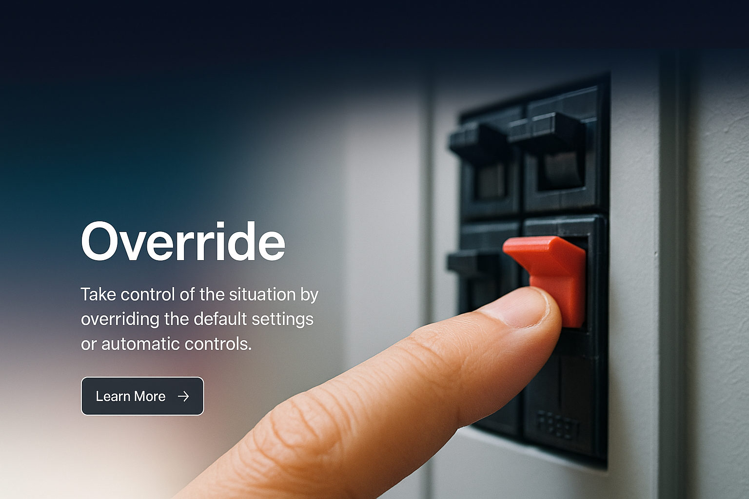 /Collection: /by davooda/Type: PNG/A modern web page design showcasing a finger pressing an override button. The layout features a gradient background and clear, readable text promoting control and customization.