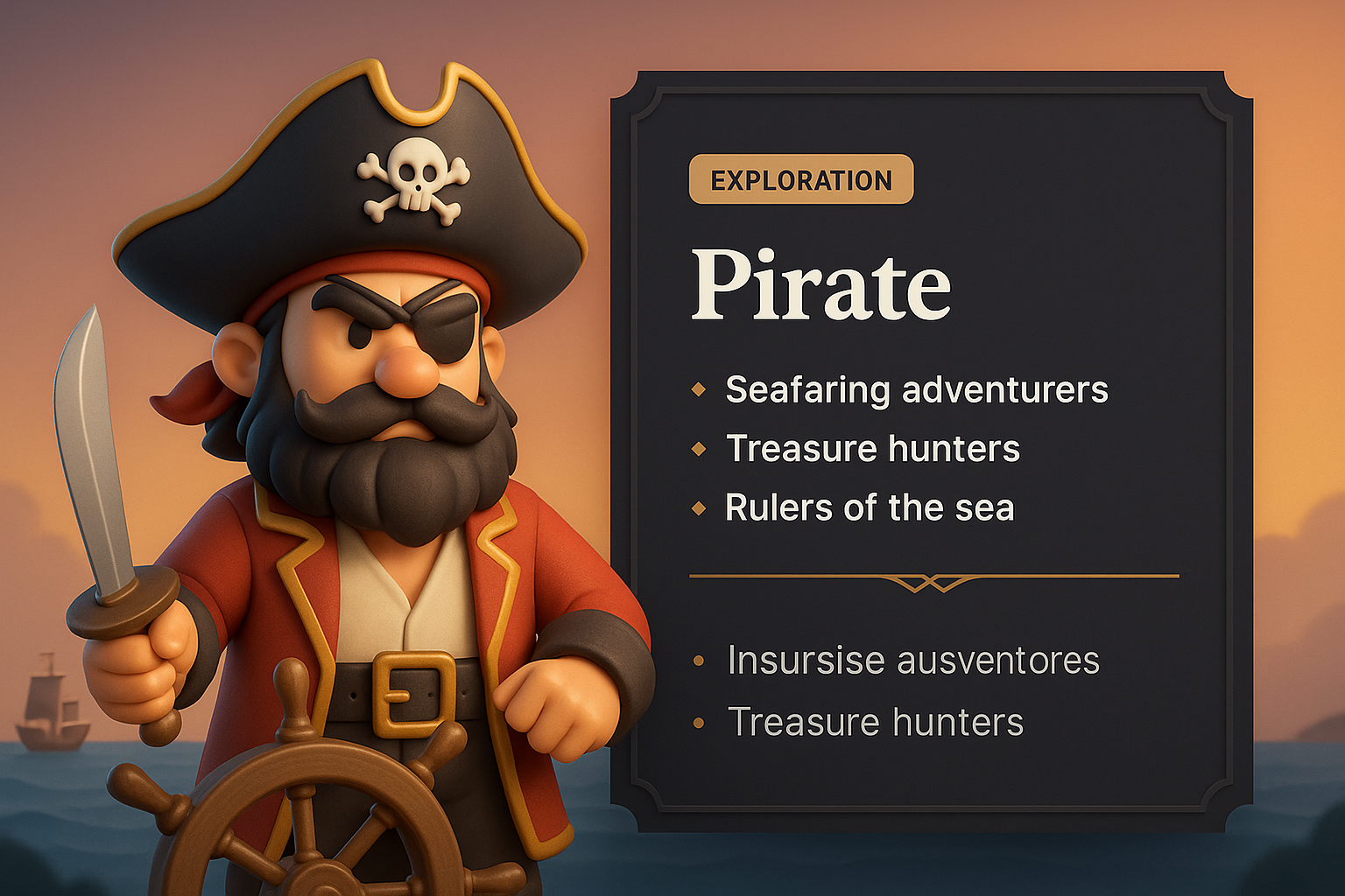A vibrant 3D illustration of a pirate holding a sword, with a ship in the background. The image features integrated text blocks for exploration themes.