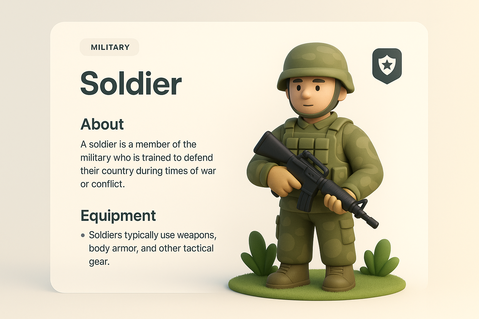 A detailed 3D illustration of a soldier holding a rifle, set against a smooth gradient background. The design includes informational text about soldiers and their equipment.