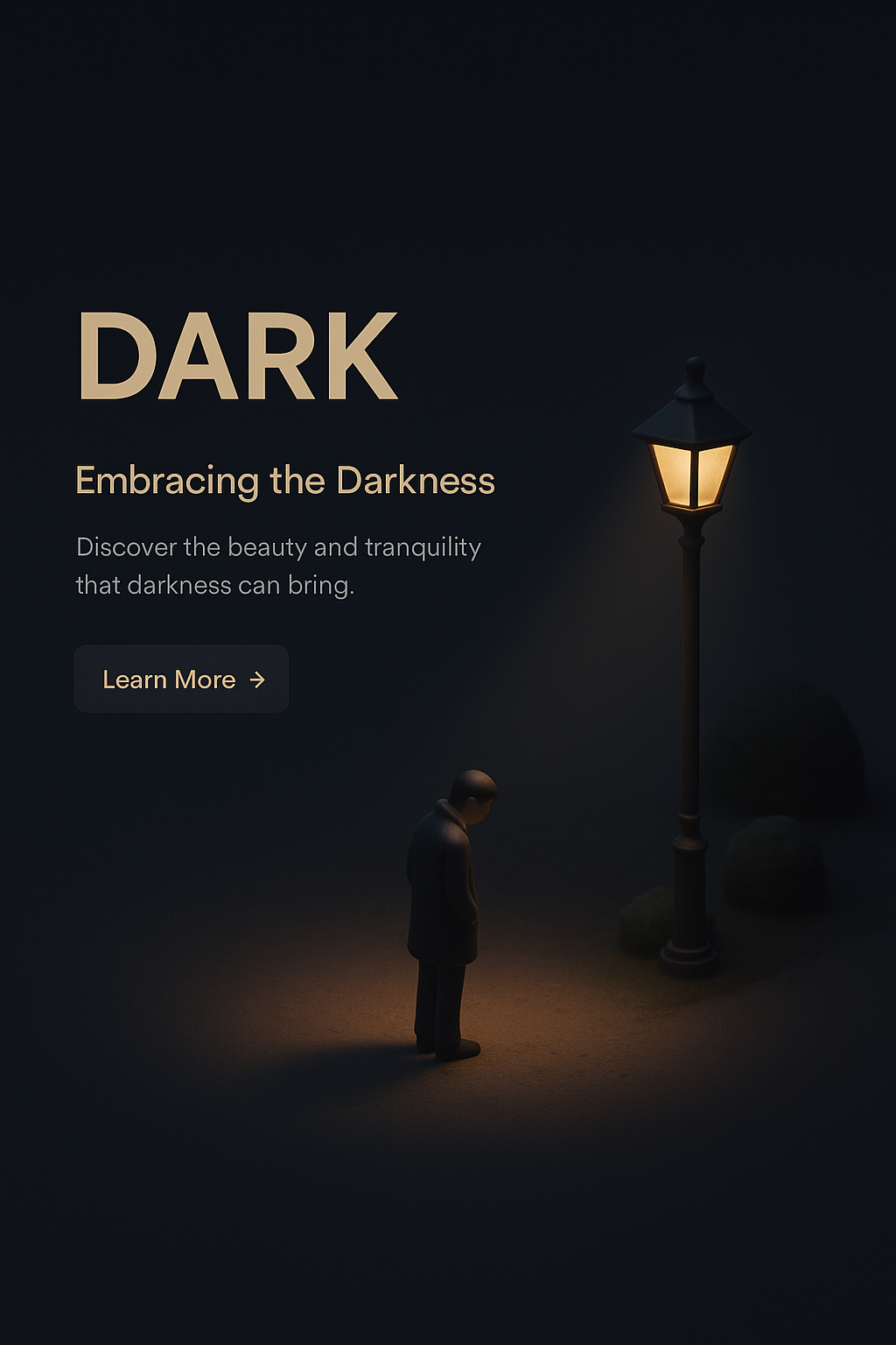 A minimalist 3D scene featuring a solitary figure under a street lamp, with a dark gradient background. The design emphasizes tranquility and beauty in darkness.
