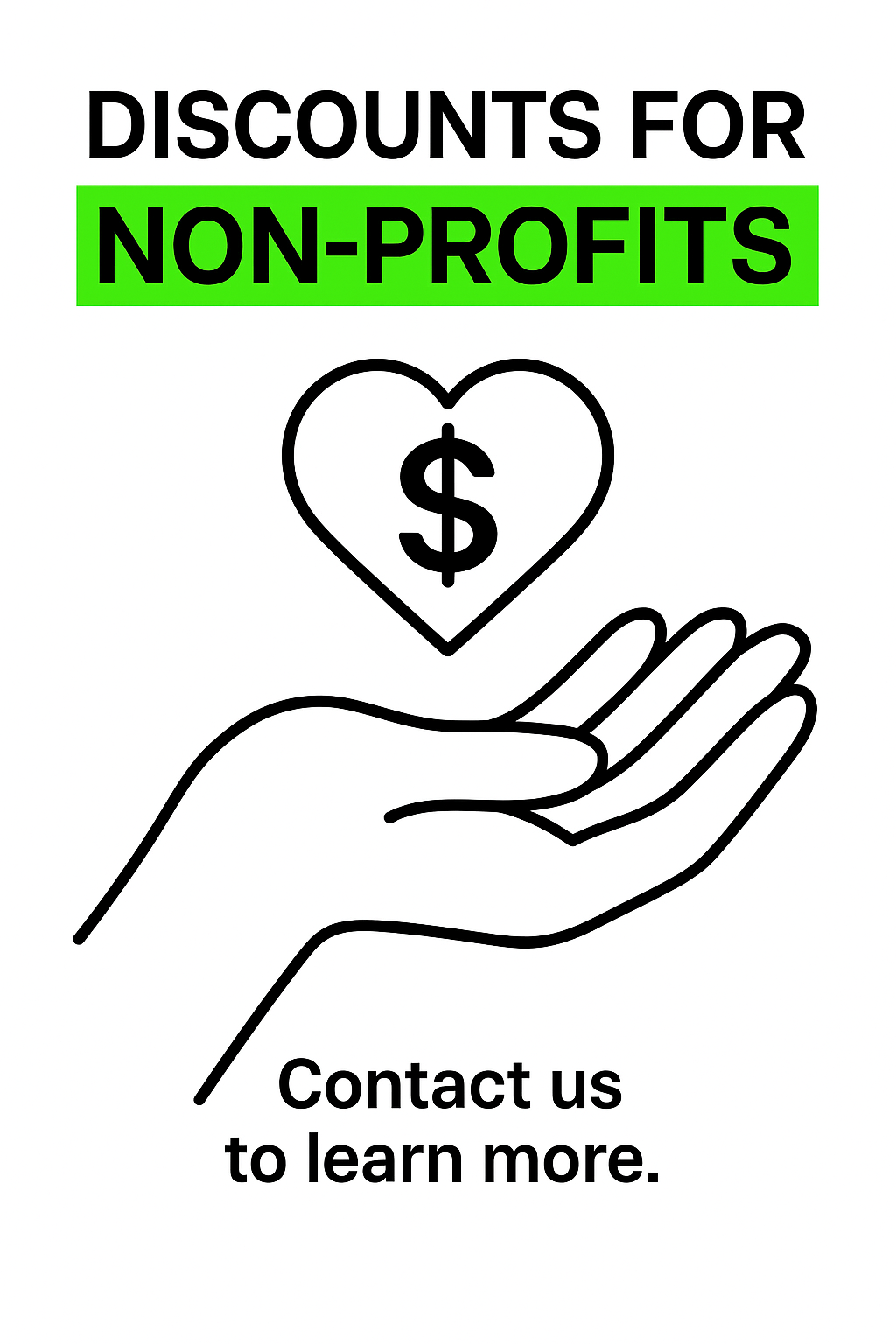 Minimalist promotional graphic highlighting discounts available for non-profits, featuring simple line art and bold typography, ideal for social media or informational material.