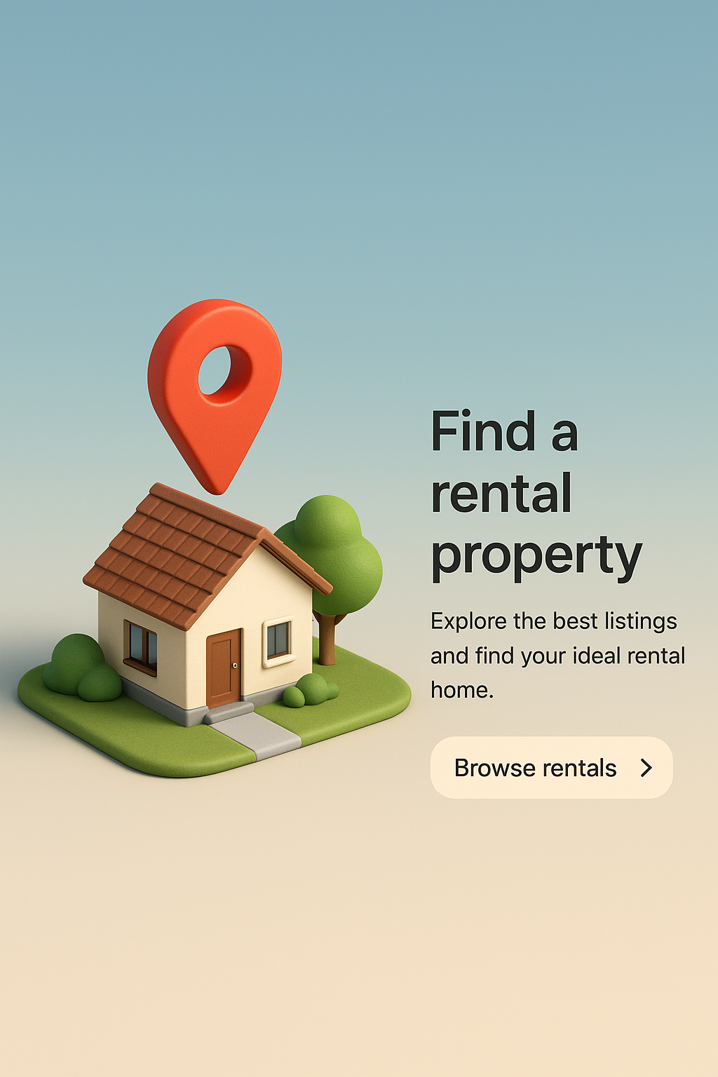 /Collection: /by davooda/Type: PNG/A detailed 3D scene depicting a small house with a location pin, set against a smooth gradient background. The scene emphasizes realism and invites viewers to explore rental listings.