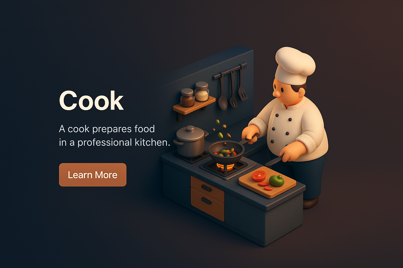 A zoomed-out view of a professional kitchen where a cook prepares food. The vibrant scene features a stove, pots, and fresh ingredients, all in realistic 3D style.