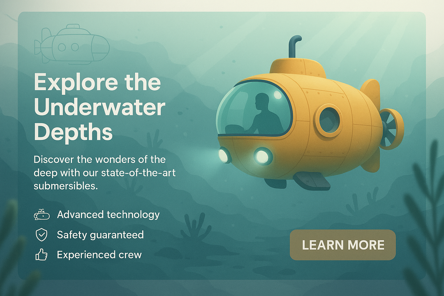 /Collection: /by davooda/Type: PNG/Engaging promotional graphic featuring a colorful submersible exploring underwater depths. Ideal for marine adventure marketing, showcasing advanced technology and safety.