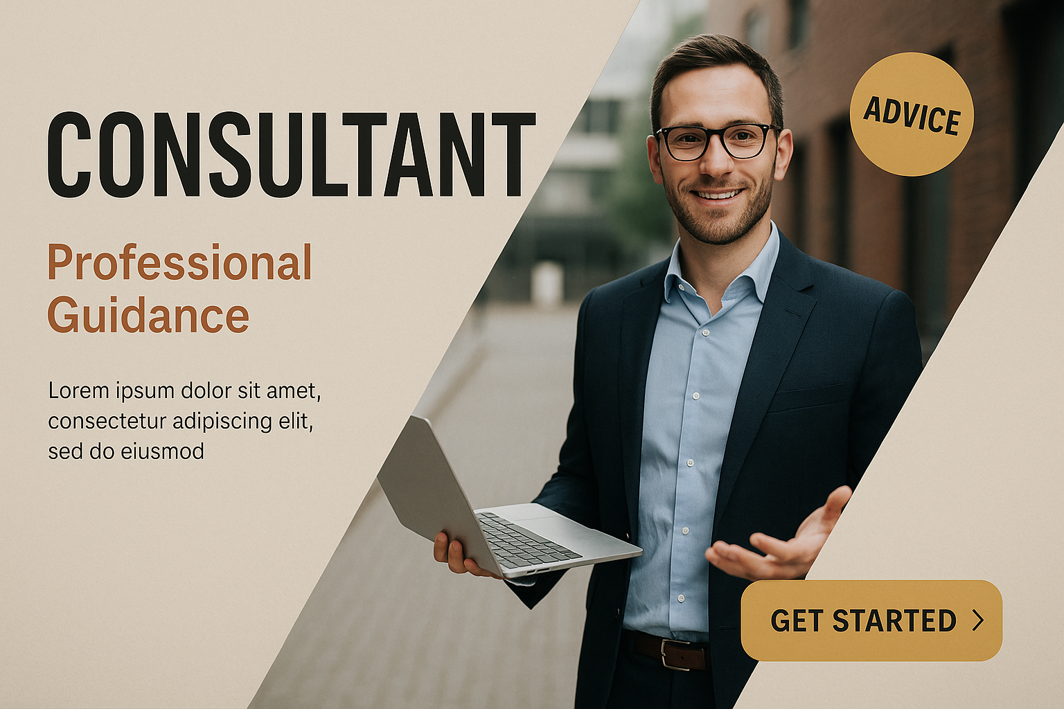 A visually appealing design featuring a consultant holding a laptop, with a clear hierarchy of text elements and a balanced composition. The background is a stylized street scene.