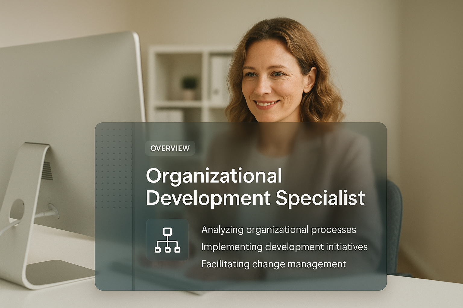 /Collection: /by davooda/Type: PNG/A professional woman smiles while working at a computer. In the foreground, a translucent panel displays text about Organizational Development, integrating design elements seamlessly.