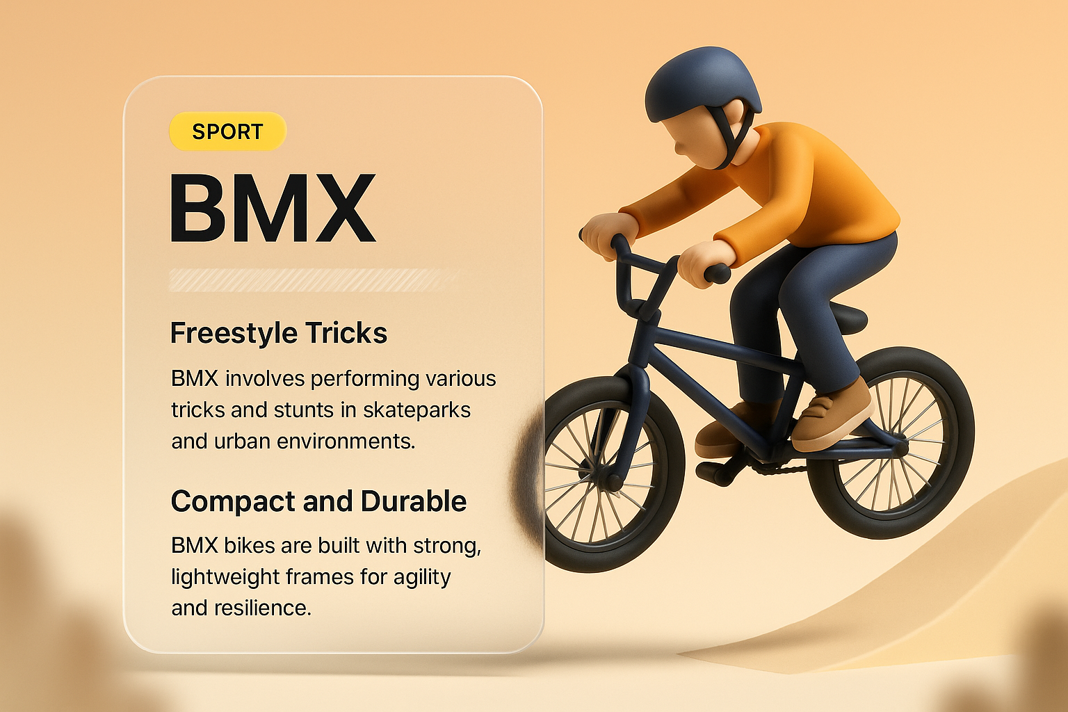 A vibrant 3D illustration of a BMX rider performing tricks, complemented by informational blocks featuring a transparent glass effect, enhancing readability.
