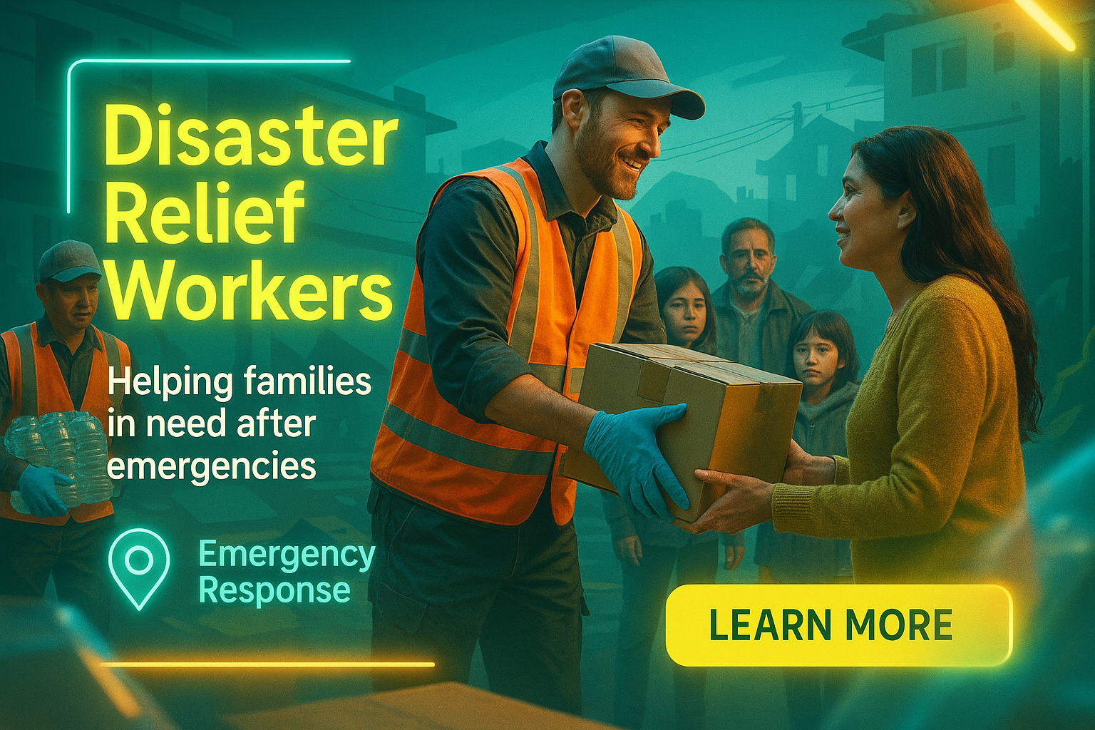 /Collection: /by davooda/Type: PNG/A vibrant promotional graphic depicting disaster relief workers assisting families during emergencies, ideal for non-profit awareness and community support initiatives.