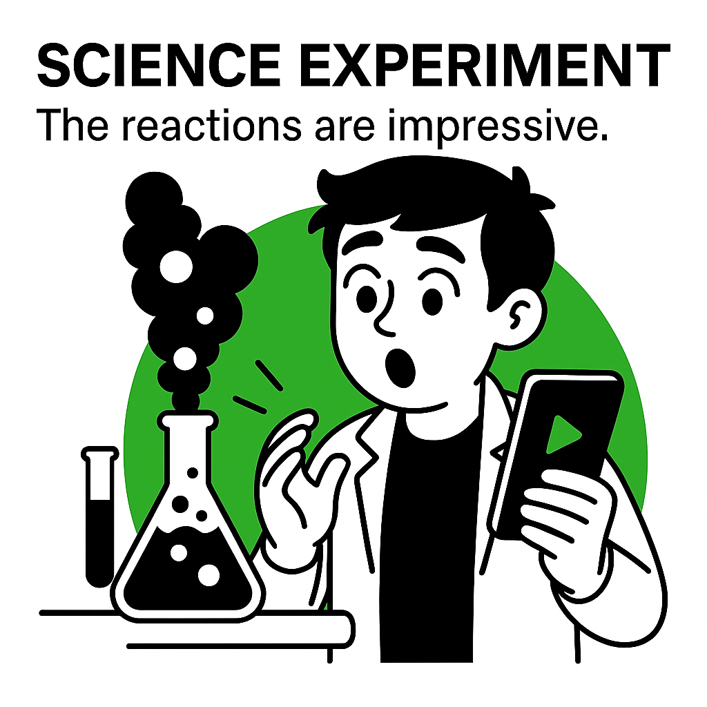 Cartoon-style illustration depicting a surprised scientist observing a chemical reaction, ideal for educational content or science-related marketing.