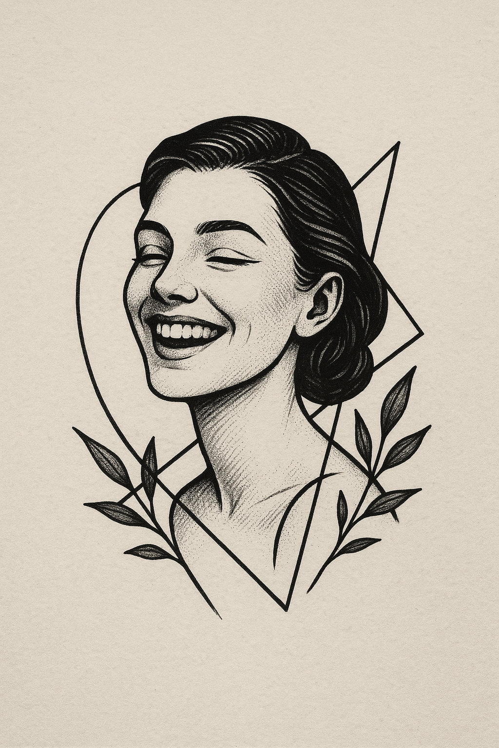 This is a monochromatic illustration featuring a smiling woman surrounded by geometric shapes and floral motifs, ideal for art prints or branding.