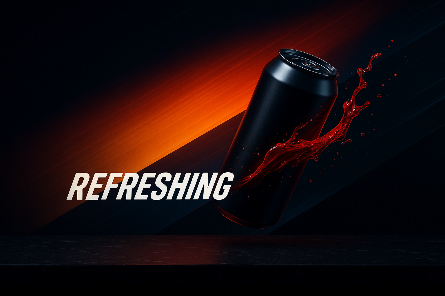 A striking image featuring a black can of drink with a vibrant splash against a dark backdrop. The dynamic diagonal lines and contrasting colors evoke speed and elegance.