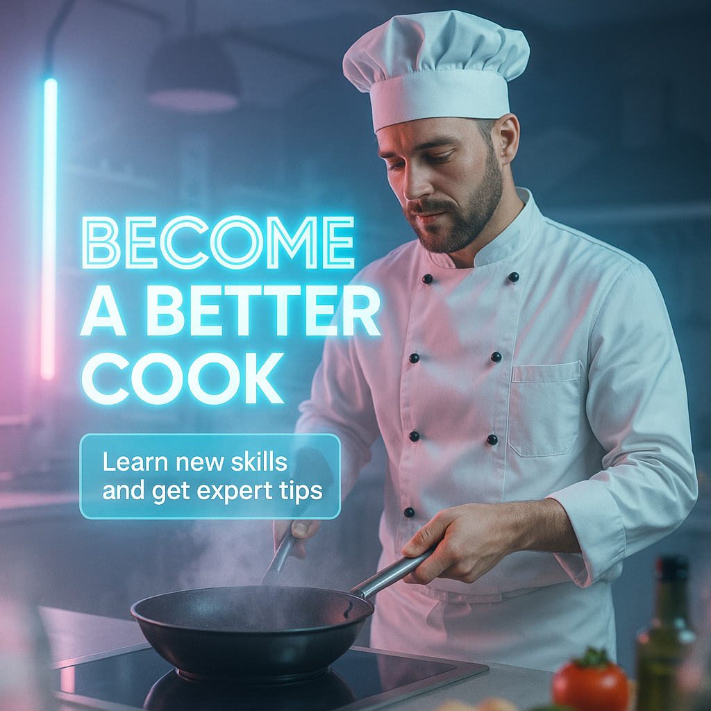 Dynamic promotional image featuring a chef cooking with neon lighting. Ideal for culinary courses or cooking tips, appealing to aspiring chefs.