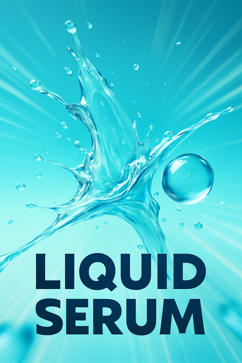 /Collection: /by davooda/Type: PNG/A vibrant splash of liquid serum against a soft pastel background, featuring dynamic lines radiating from the center. The bold title 'LIQUID SERUM' stands out prominently.