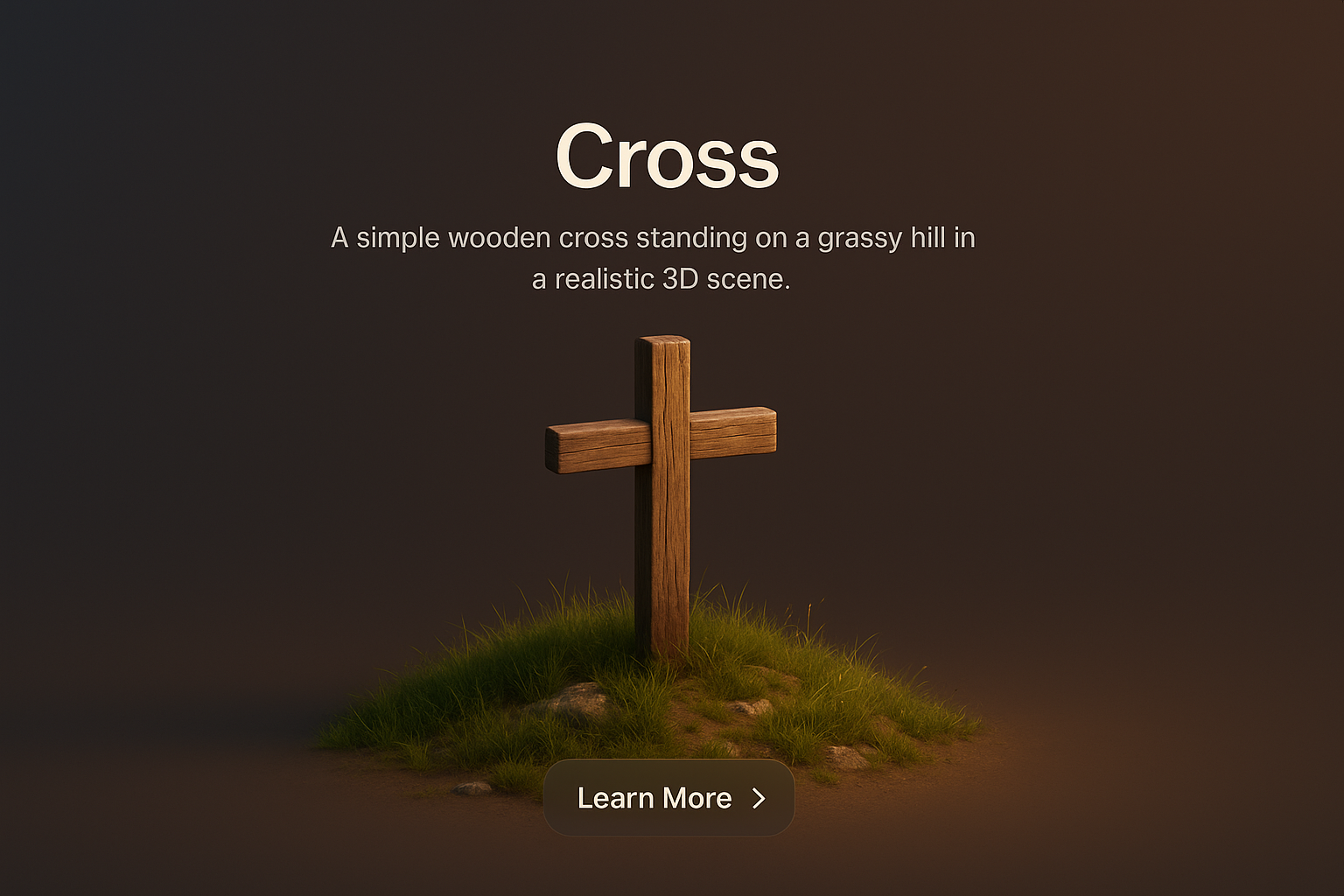 /Collection: /by davooda/Type: PNG/A realistic 3D depiction of a wooden cross on a grassy hill, set against a smooth gradient background. The scene features a simple yet impactful design, emphasizing the cross's natural surroundings.